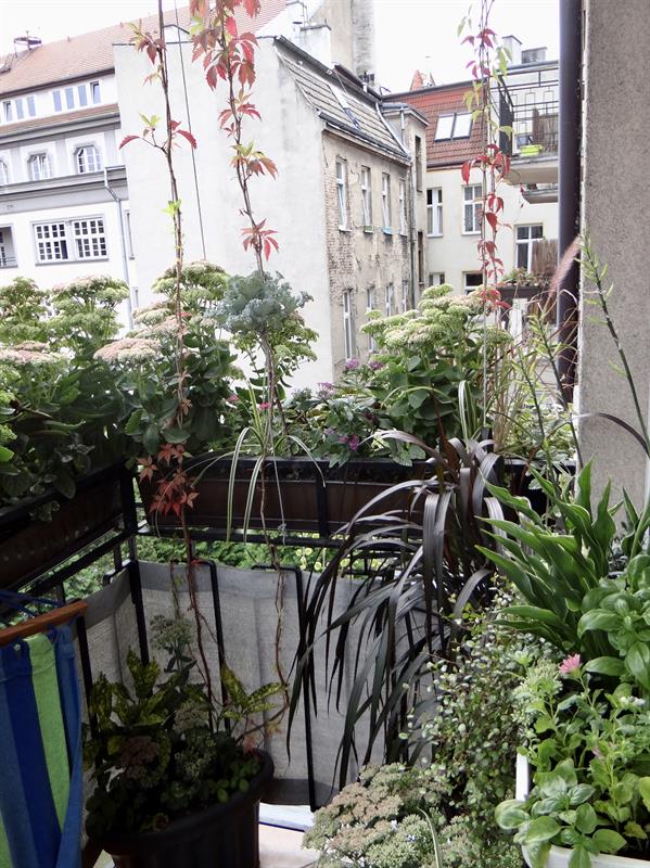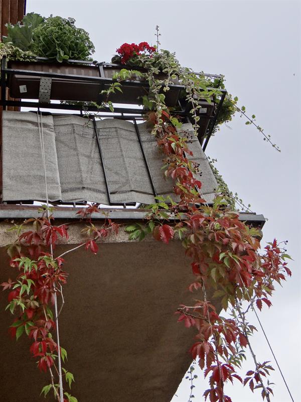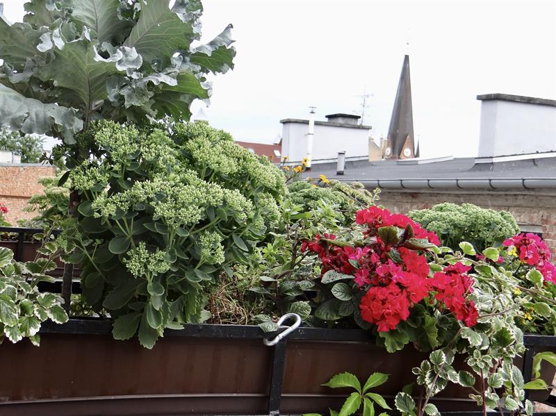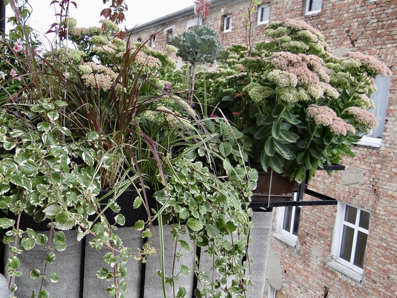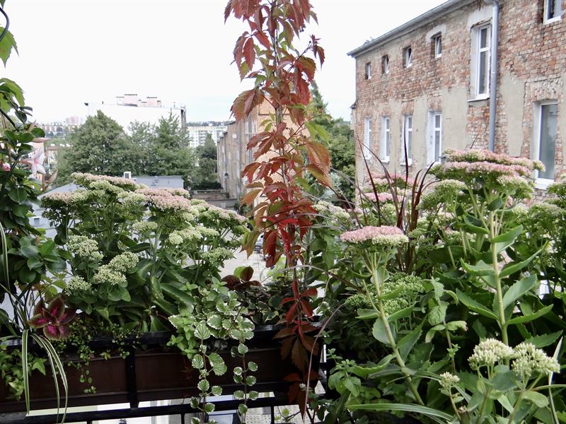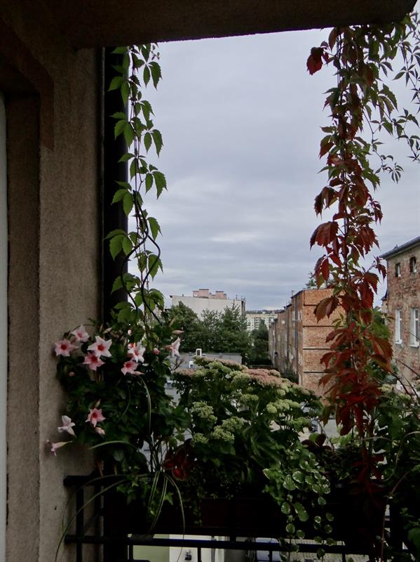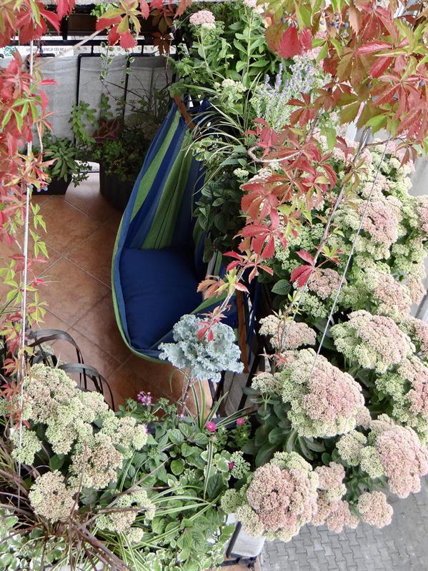Właśnie winobluszcz pięciolistkowy, zwany niekiedy dzikim winem, oplatający swobodnie balustrady - choć pod czujnym okiem pani Joanny i przycinany, kiedy zanadto się rozrasta - tworzy jakby ramę dwupoziomowego balkonowego okna w kwiatach i zieleni. Z koleusami, a w części powyżej komarzycami, przetykanymi pelargoniami i aksamitkami. Do tego gęste krzaczaste marcinki, funkie, perowskia, hedera i aukuba odmiany „Variegata" z nakrapianymi żółtymi plamkami liśćmi.