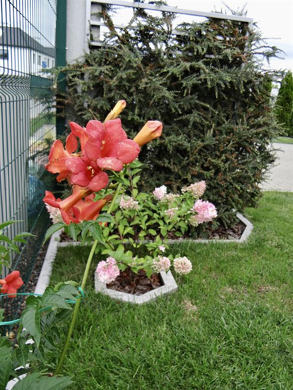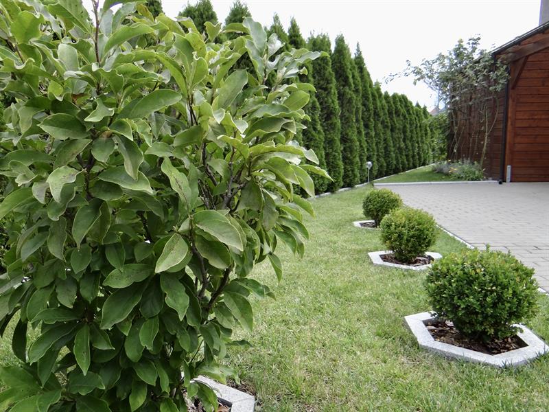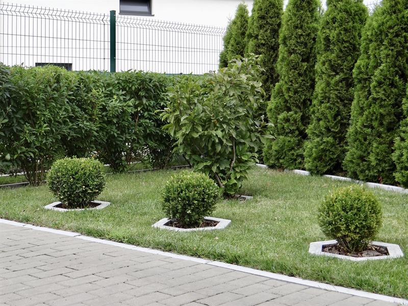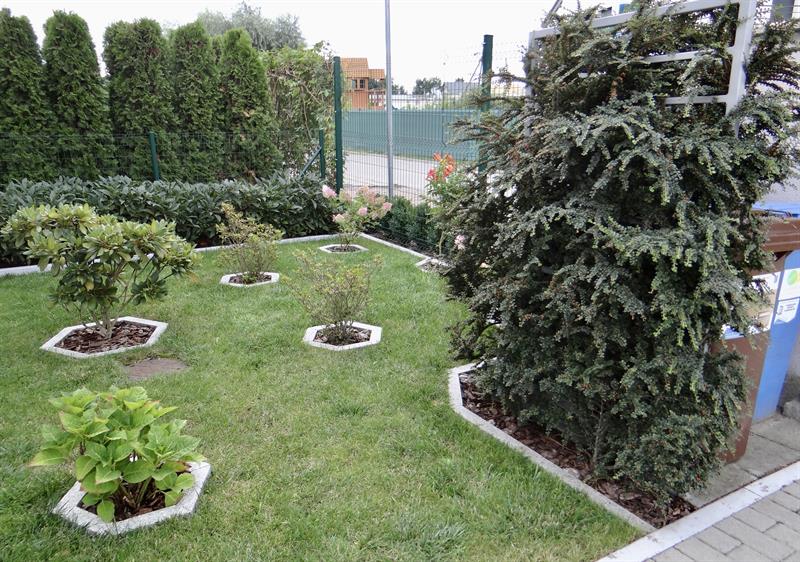 Każdy z dwóch zieleniących się soczyście i równo przyciętych trawników po bokach ma swe oszczędne, z umiarem dobrane roślinne akcenty, acz wyraziste i zarazem tworzące spójną w formie przestrzeń. Już od wejścia wzrok przyciąga okazała magnolia i bukszpany starannie przystrzyżone w kule, a także rosnące wzdłuż płotu strzeliste tuje. Tę drugą, nieopodal, zdobią m.in. hortensje, rododendron, azalie, forsycje i rosnący tuż przy płocie na razie jeszcze niewielki, równie dekoracyjny i pnący się milin amerykański, rozmnożony z takiegoż, tyle że już bardziej okazałego, który rośnie na należącej do p. Kocewiczów działce. Wiosną przestrzeń przed domem w pasie trawy opanowują z kolei tulipany i krokusy.