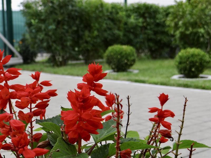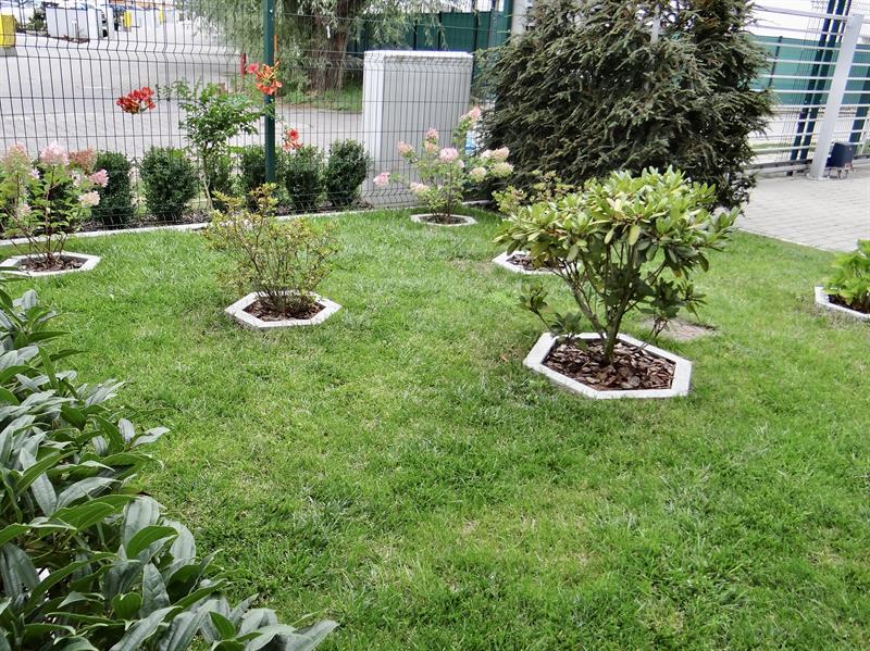 Elementem dodatkowym ekspozycji roślin są wykonane wokół każdej z nich z kamienia sześciokąty. A tuż pod oknami ustawione na pasie wysypanym kamykami skrzynki z biało-różowymi pelargoniami.