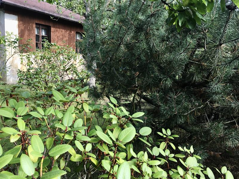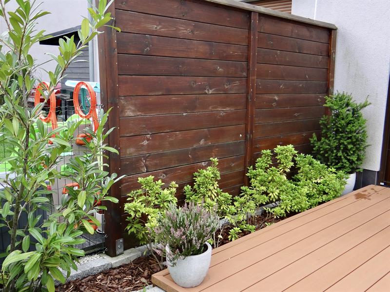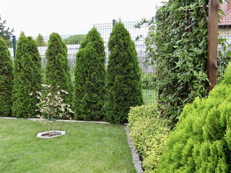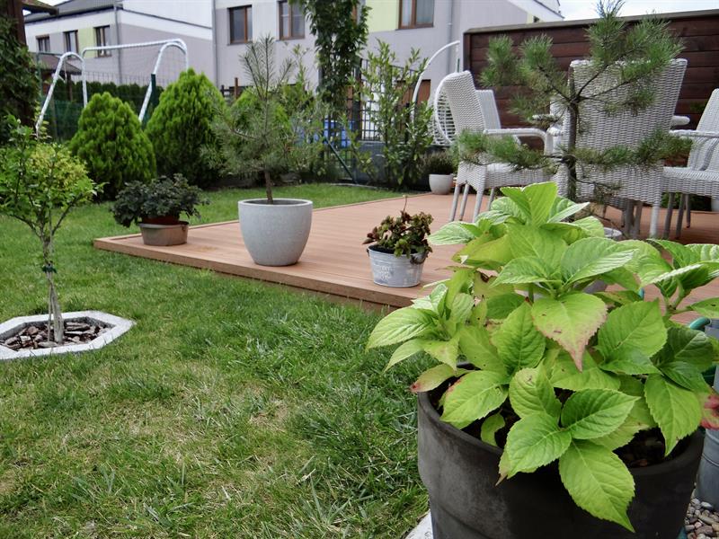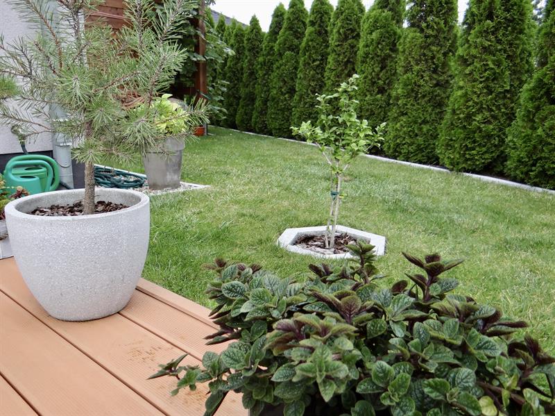 Główna część z tarasem jest nieco skryta na tyłach. Niewielka, ale powierzchni wystarczyło w niej gospodarzom, by urządzić pas równie zadbanego trawnika, obsadzonego dobranym wcześniej zestawem krzewów, w tym tych zimozielonych. Są więc tam: pergola z clematisem i wiciokrzew Henry’ego, niewysokie tuje kuliste, tawuła w dwóch odmianach, oraz żywotniki Auera Nana. Punktowo i tu, jak przed domem, w obwódkach kamiennych o kształcie sześciokątów m.in. hortensja, hibiskus, wierzba ozdobna, w rogu dwie laurowiśnie. Częścią ogrodowej kompozycji są też rośliny rozstawione w donicach, a wśród nich komarzyce, sosenki, pierisy i wrzosy. ©℗