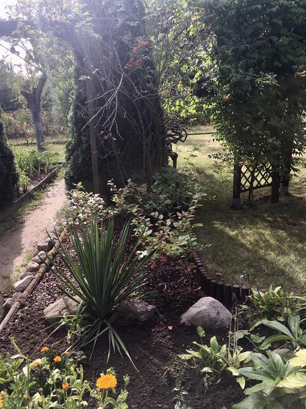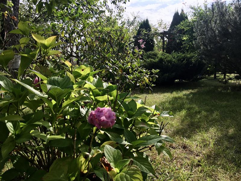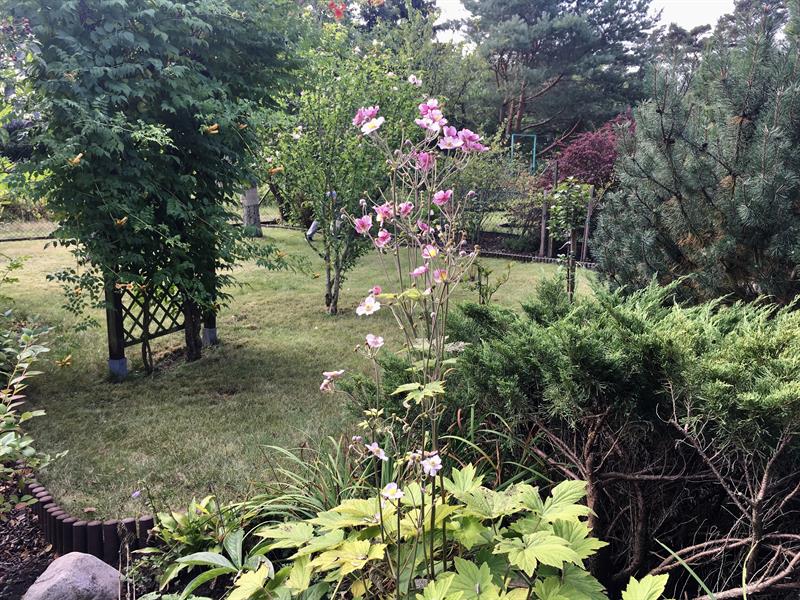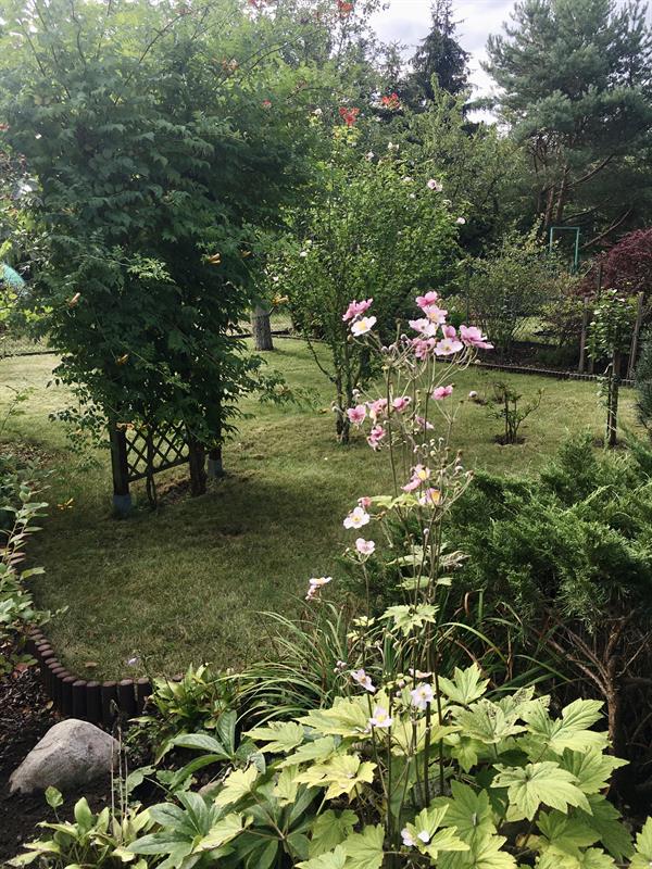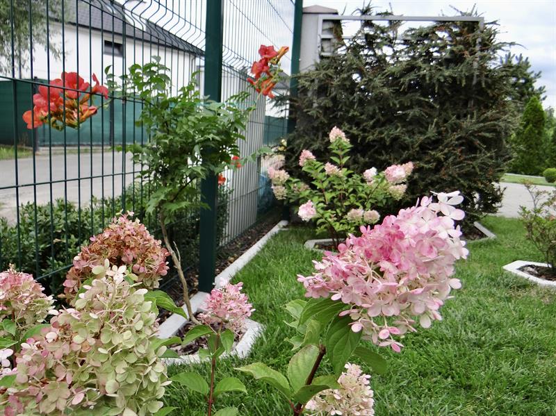 Tuż przy wejściu na teren posesji uwagę też zwraca pomysłowo wykonany śmietnikowy parawan. Oplata go irga, tworząc niezwykle funkcjonalną, bo maskującą pojemnik, dekoracyjną ścianę. W pierwszej wersji – jak opowiada pani Maria – w tym miejscu miał rosnąć ognik, ale z niego zrezygnowała, bo ma ostre kolce. Teraz takiego właśnie, a nie innego doboru i wyboru nie żałuje i liczy, że irga, przyrastając w kolejnych latach, stanie się idealnym materiałem do stworzenia z niej naturalnego baldachimu. Własny ogród był zresztą marzeniem p. Marii i od kilku lat się spełnia.