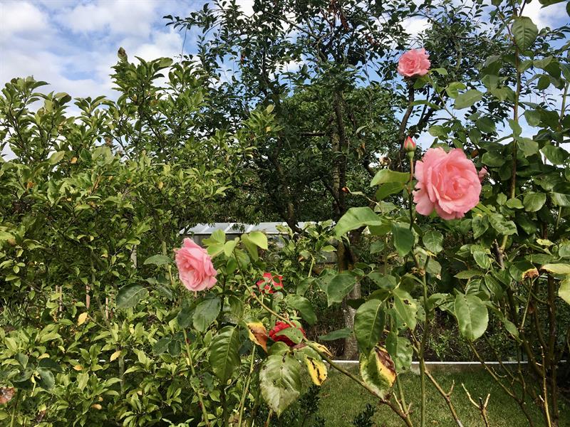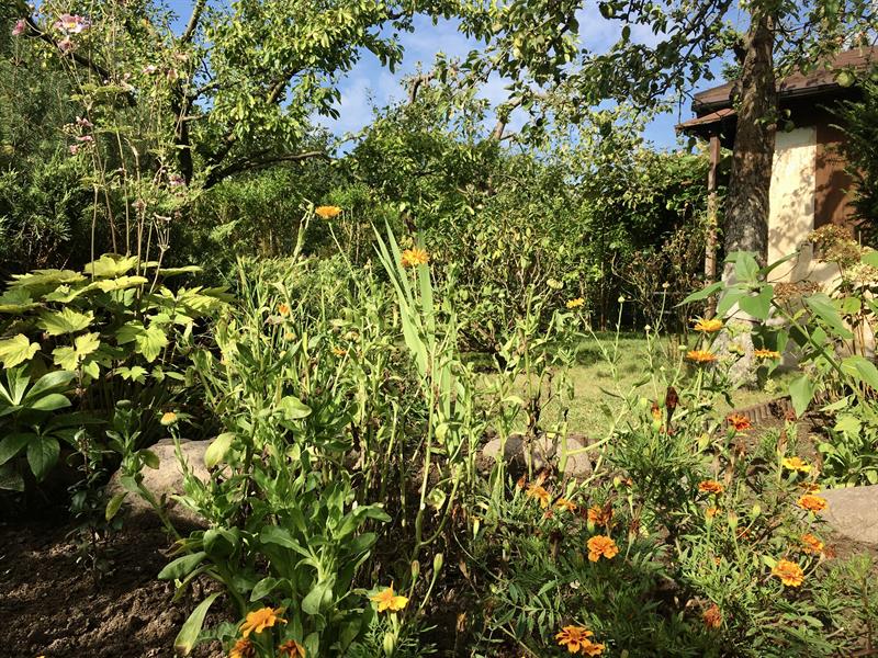 Położenie sprawia, że ogród z trzech stron okala dom. Dwie jego części od frontu rozdziela pas podjazdu z altaną pośrodku. Elementem dekoracyjnym tej ostatniej jest wąska rabata z pergolą, której zadaniem jest podtrzymywanie pnących róż, a poniżej wypełniające ją lawenda i ostatnie z jeszcze kwitnących nagietki. Z narożnika wyłania się zaś winorośl. A dodatkowo przy wejściu czerwienią się lwie paszcze.