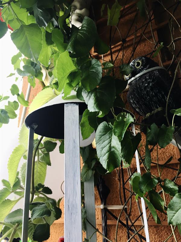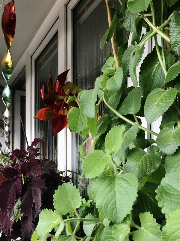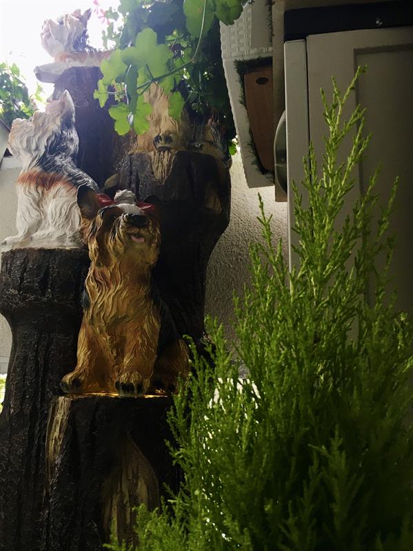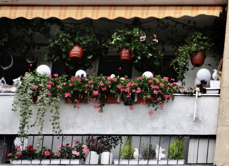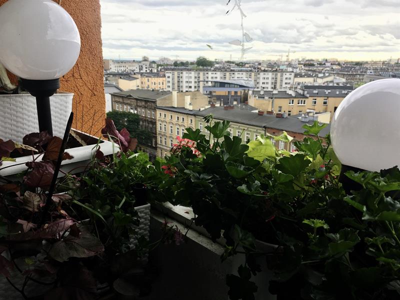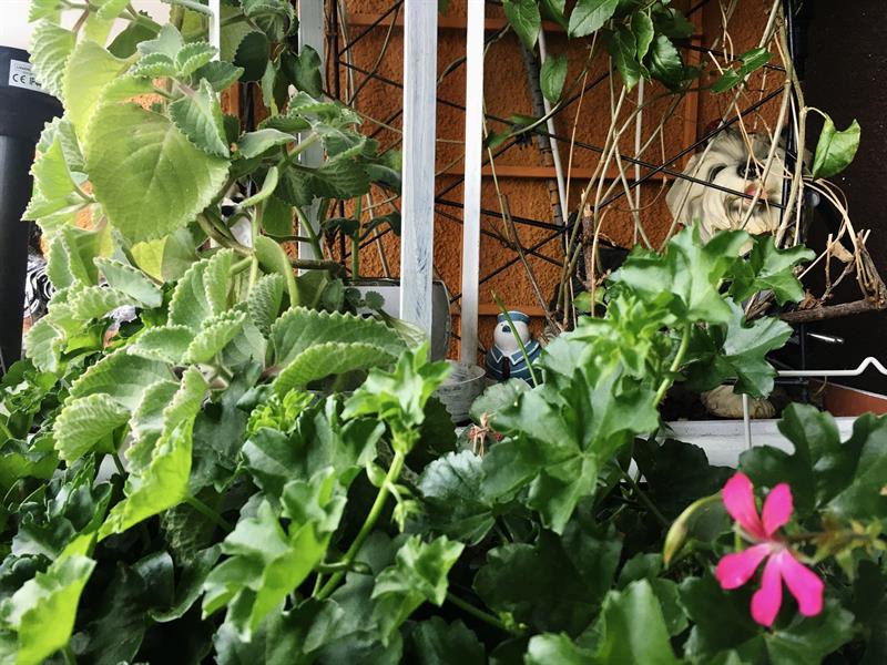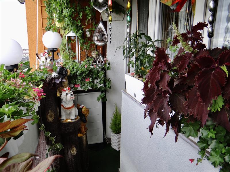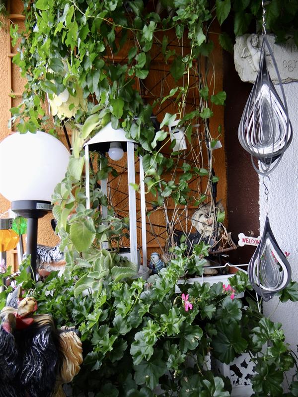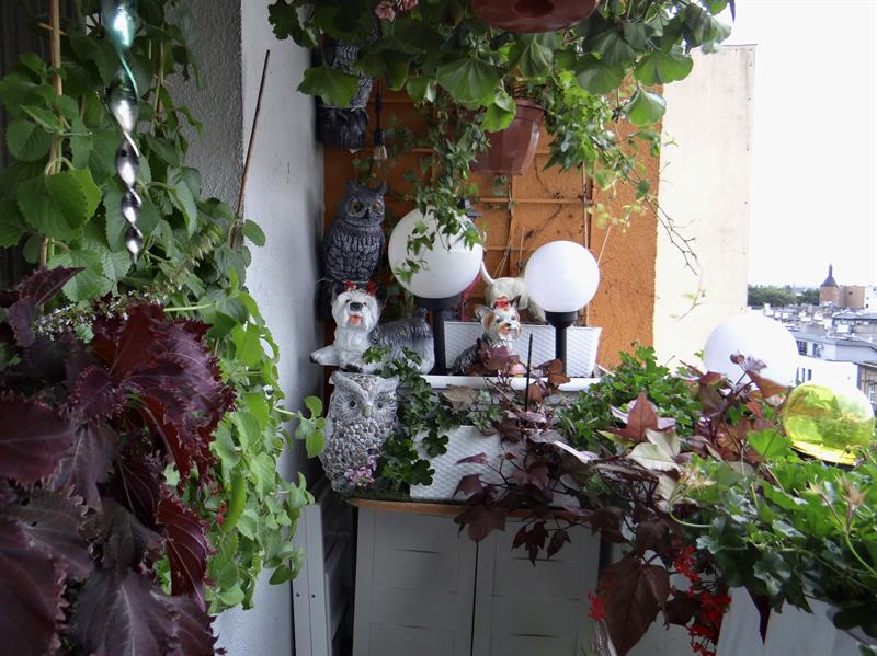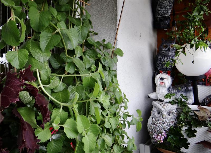 Balkon to feeria kolorów i domena - rzecz jasna - pani domu. Ale najwięcej czasu spędzają na nim yorki – domowe psiaki, czyli Tofik i Mikuś, które do towarzystwa mają gliniane wersje ich samych, naturalnej wielkości ogrodowe rzeźby. Nie brak i innych zwierzęcych akcentów w postaci figurek ptaków. W założeniu miały być elementem odstraszania nieproszonych gości, głównie gołębi, ale te obecnością takich lokatorów na wysokościach zanadto się nie przejmują. Dla rozweselenia mienią się girlandy kręcą wiatraczki. A całość podświetlana o zmierzchu światłem ogrodowych lamp zasilanych promieniami słońca.