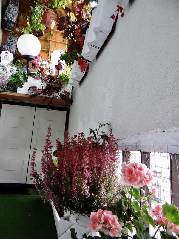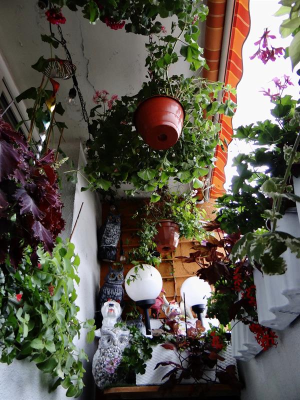W wąskiej przestrzeni o długości 4 m o stworzeniu wygodnej enklawy do wypoczynku marzyć trudno, jak choćby rozstawieniu leżaka czy stolika z fotelikami, ale za to – jak pokazują od lat Anna i Jerzy Pruscy – można z powodzeniem od wiosny do późnej jesieni przekształcić ją w zielono-kwiatową ścianę. Od wczesnej wiosny ozdobą są zazwyczaj bratki i prymule. A już tę na dłużej, bo letnio-jesienną kompozycję z pelargonii uzupełniają z kolei begonie, surfinie, petunie lub fuksje. Na okiennym parapecie tym razem w białej skrzynce miniplantacja papryczek, mięta z cytryną parapecie. Po balkonowych ścianach i suficie pnie się rdest. Na posadzce wzdłuż balustrady też okaz pelargonii różowej o białych obwódkach, po sąsiedzku kilka miniaturowych smukłych i soczyście zielonych tuj. Do tego komarzyce.