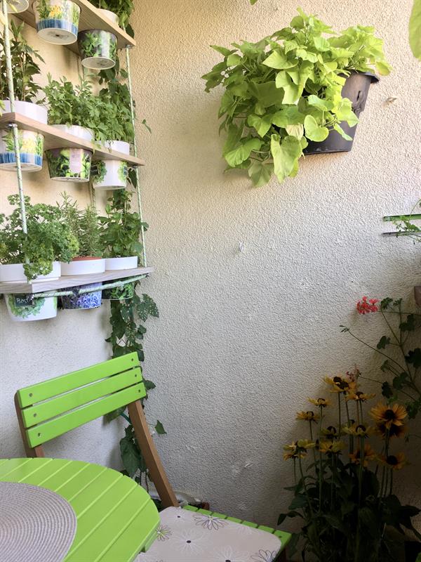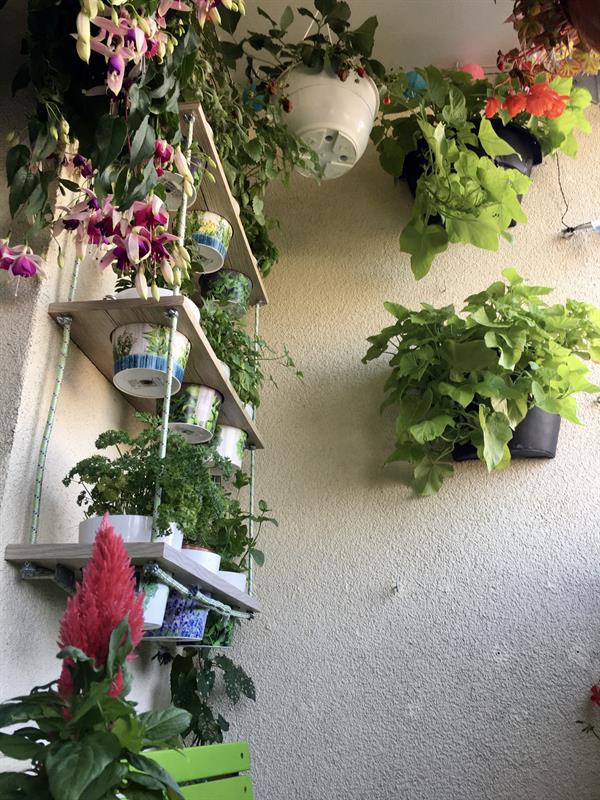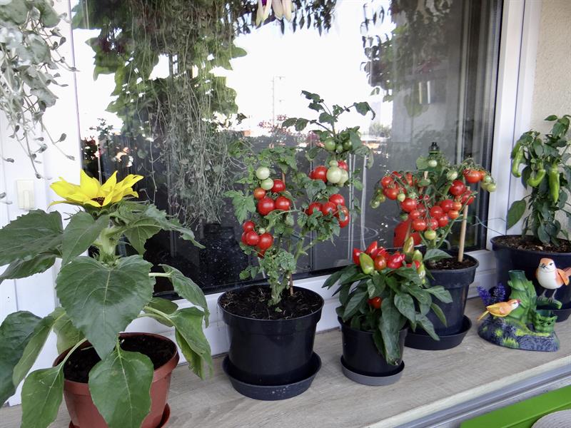 W jednym z narożników przy ścianie – zgrabna konstrukcja z deseczek, podwieszona na linach. To z kolei kącik zielarski z półeczkami, a w nich piętrowo doniczki z własną uprawą ziół, wśród nich szałwia, tymianek, rozmaryn, bazylia, melisa cytrynowa, mięta. Na parapecie tuż obok miniwarzywnik pani Wandy, z dojrzewającymi papryczkami, koktajlowymi pomidorkami i słonecznikiem. A pod nimi stoją dwa krzesełka i stolik, czyli skrojony na miarę kącik wypoczynku. W przeciwległym narożniku znajduje się kwietnik, gdzie poczesne miejsce zajmują w każdym sezonie w różnych zestawach i odmianach m.in.: sitowie, bakopa, portulaka, wrzosy, surfinie, broda starca, begonki, rozwar, dzwonek campanula czy sunwitalia rozesłana.
