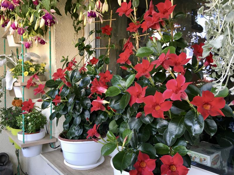 Kolorytu całej enklawie dodają delikatnie kołyszące się nad głową donice obsypane kwiatami begonii i fioletowo-różowo-białych fuksji i przywodzące skojarzenia z warkoczami, niejako w kontraście do soczystych barw innych otaczających je roślin srebrzyste dichondry. Na drugim z parapetów zaś dominują o lśniących liściach krwisto-czerwonej barwy sundaville.