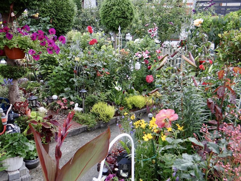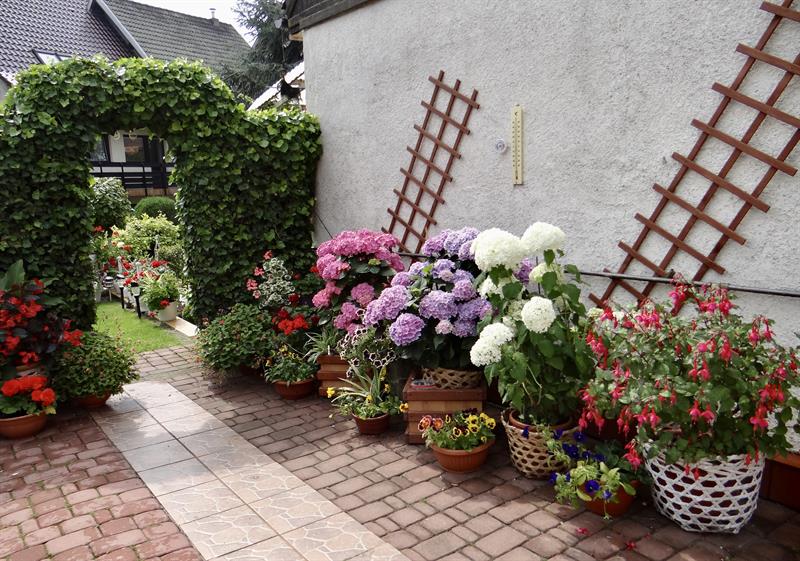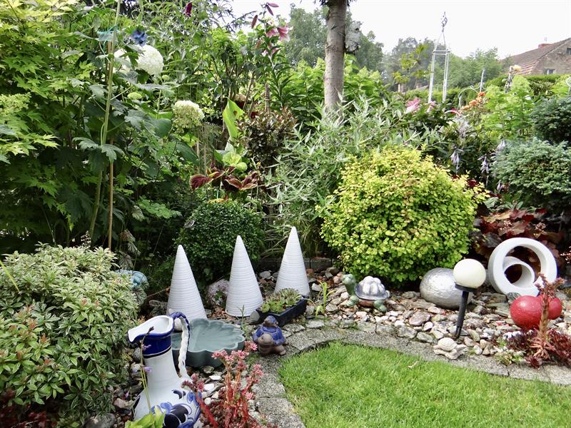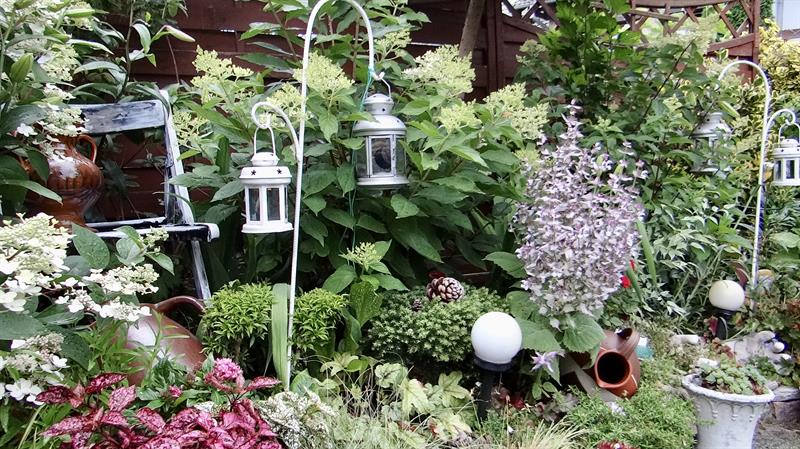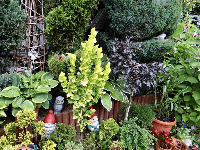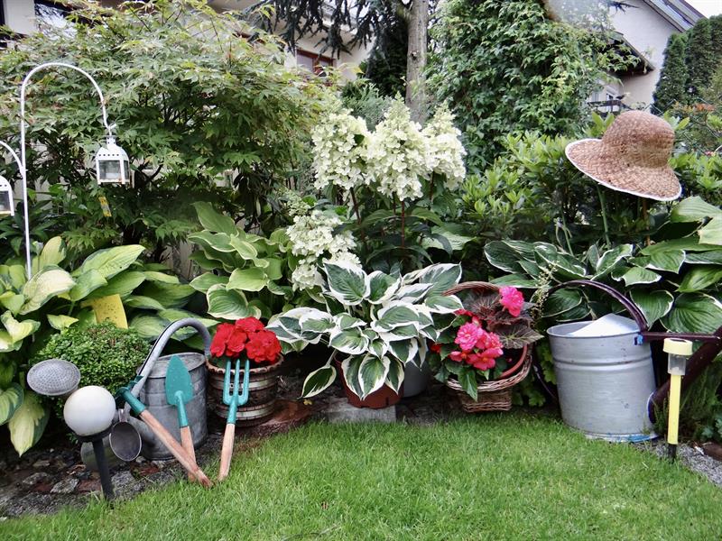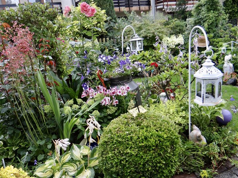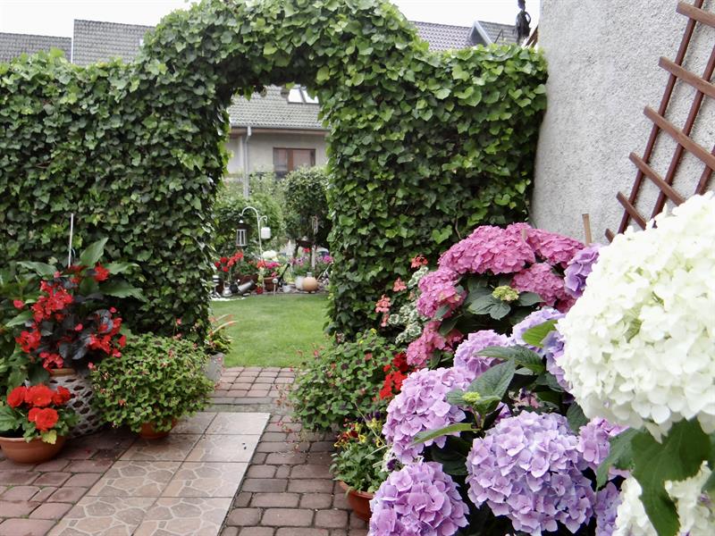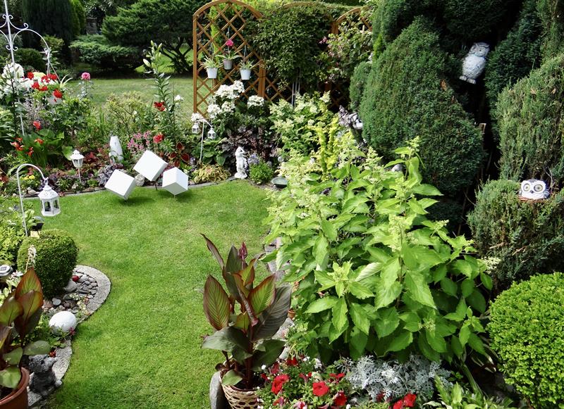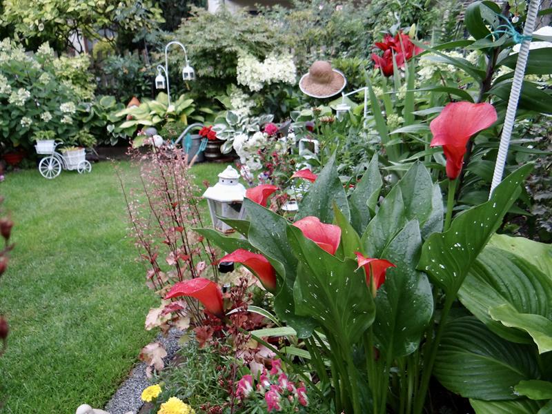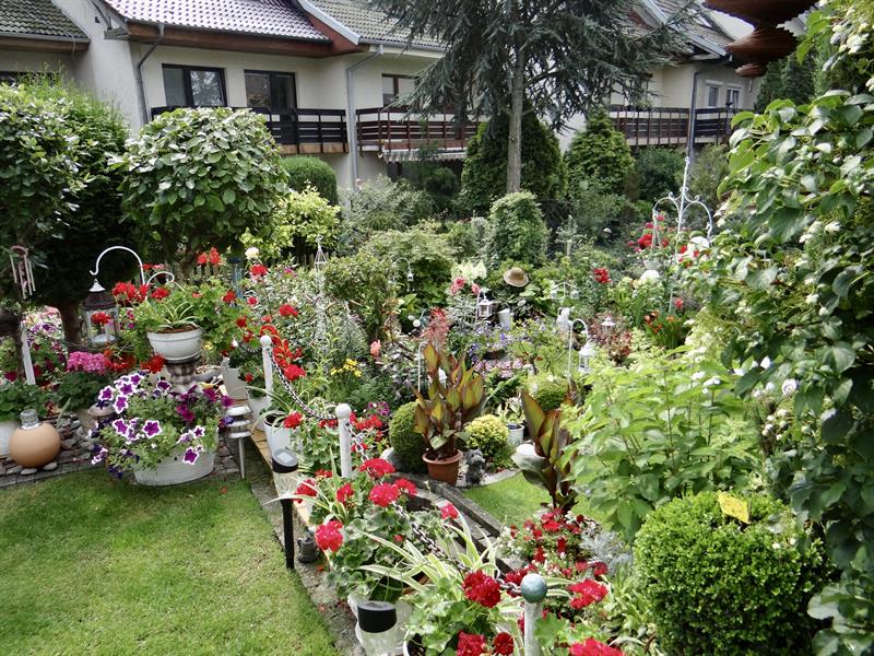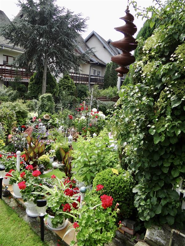 Ten ogród aż kipi bogactwem roślin. Od trzydziestoletnich podcinanych i formowanych tuj, bukszpanów po najnowsze z nabytków jak szałwia omszała, hortensje, begonie włoskie, jarzębina czy kalle (zwane też kaliami). Na niewielkim skrawku przydomowego podwórka, bo na 160 m kw., zdążyła się uzbierać ich całkiem spora kolekcja. Ciesząca gospodarzy, jak i odwiedzających ich bliskich, sąsiadów i znajomych. To właśnie tam zazwyczaj goście najpierw kierują swe pierwsze kroki. Ukształtowanie terenu pozwoliło stworzyć tu ogród na kilku poziomach z kącikiem do wypoczynku na najwyższym z nich i opadający tarasowo w dół.