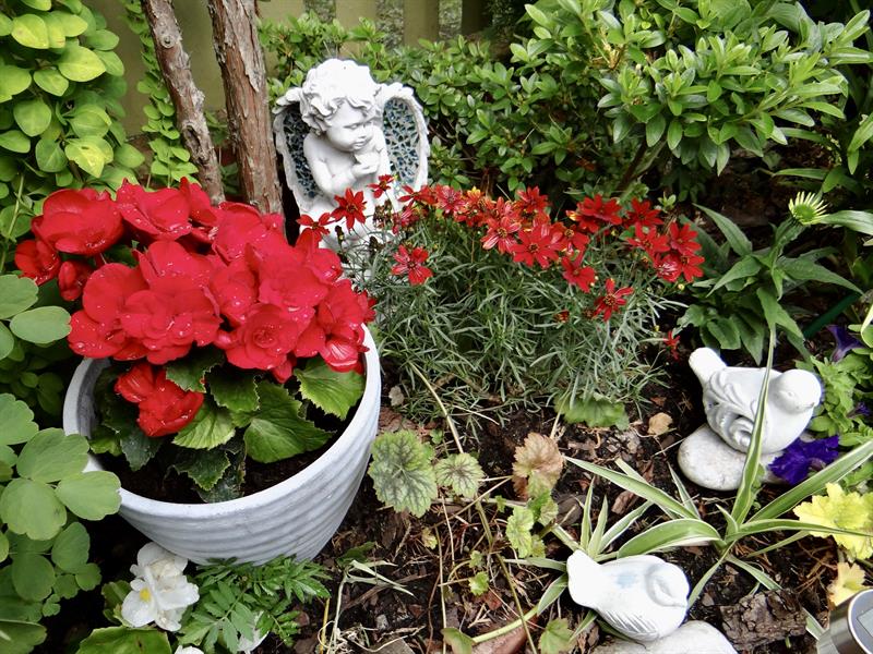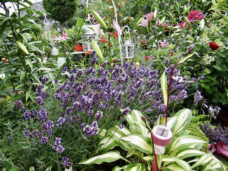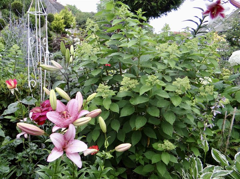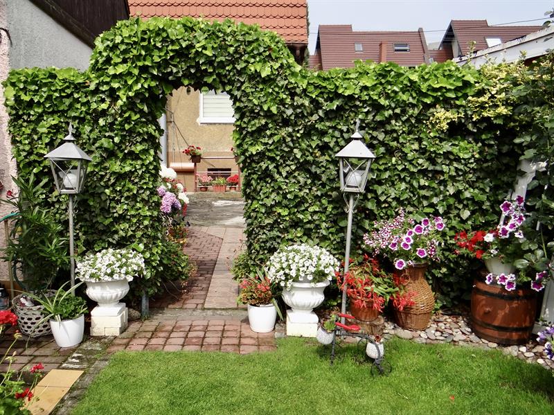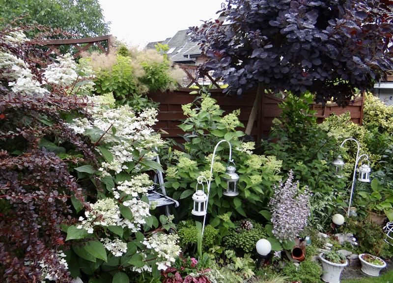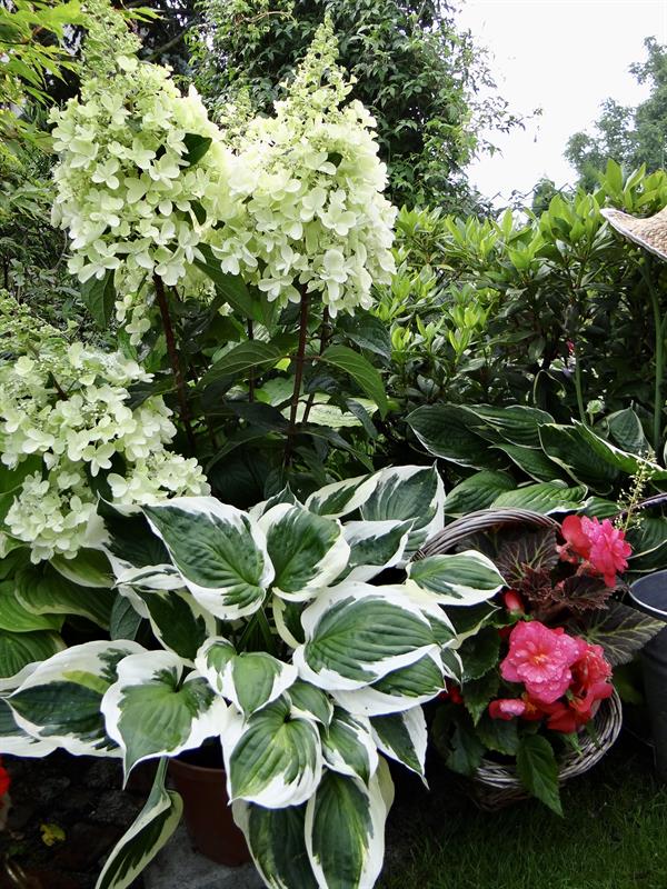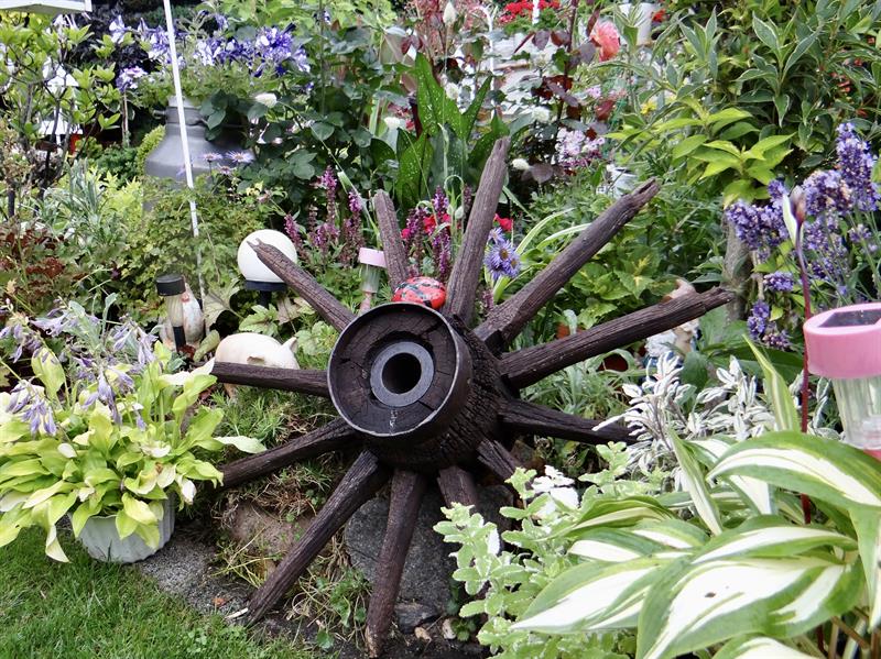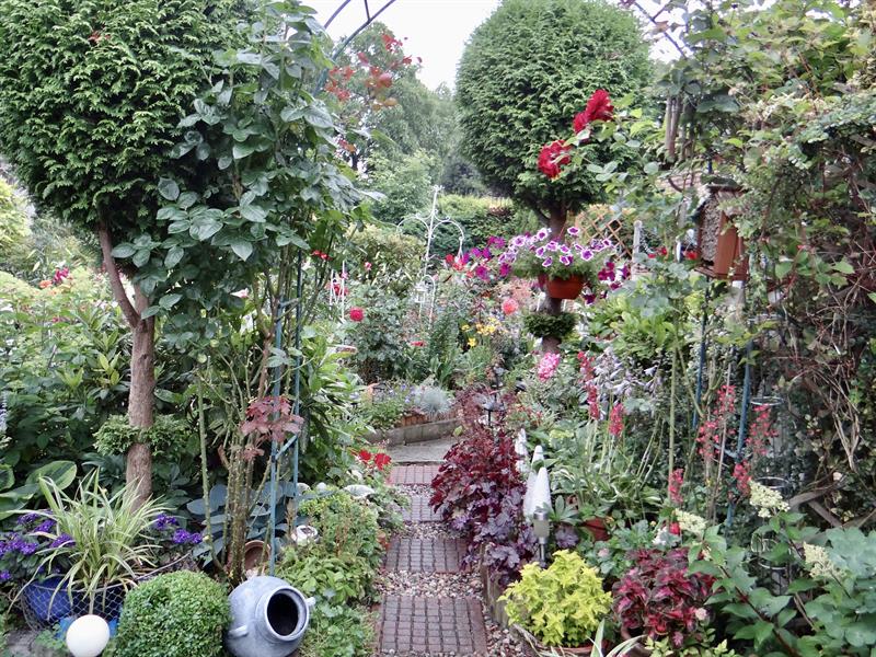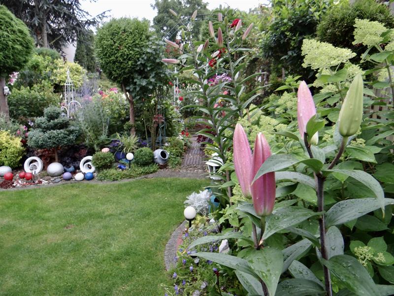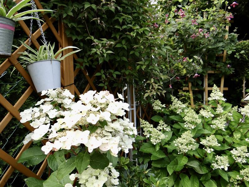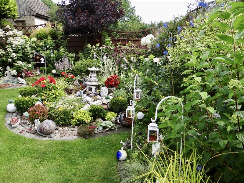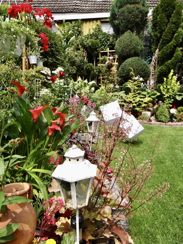 Ten ogród aż kipi bogactwem roślin. Od trzydziestoletnich podcinanych i formowanych tuj, bukszpanów po najnowsze z nabytków jak szałwia omszała, hortensje, begonie włoskie, jarzębina czy kalle (zwane też kaliami). Na niewielkim skrawku przydomowego podwórka, bo na 160 m kw., zdążyła się uzbierać ich całkiem spora kolekcja. Ciesząca gospodarzy, jak i odwiedzających ich bliskich, sąsiadów i znajomych. To właśnie tam zazwyczaj goście najpierw kierują swe pierwsze kroki. Ukształtowanie terenu pozwoliło stworzyć tu ogród na kilku poziomach z kącikiem do wypoczynku na najwyższym z nich i opadający tarasowo w dół.