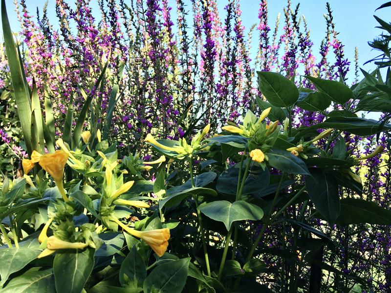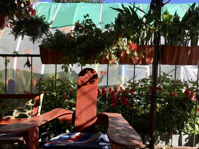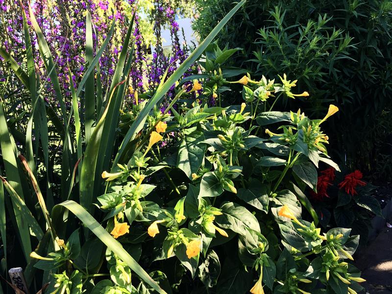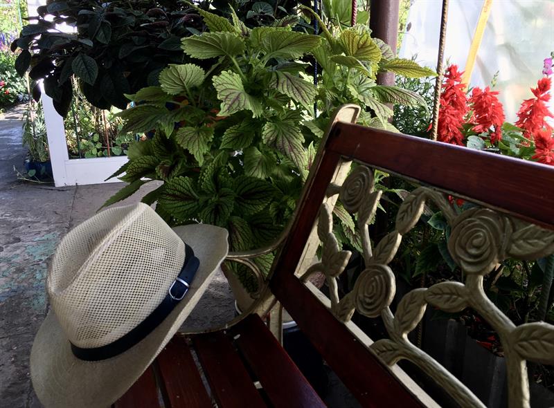 Można też rozsiąść się w fotelu lub na krzesłach przy ławie nieopodal altany otoczonej krzewami hibiskusów, róż i kiwi. W cieniu pergoli oczy cieszą begonie, nasturcje, ślazy. I dziwaczki jalapa jako te szczególne pośród pozostałych, bo za dnia poskręcane w cienkie trąbki, ukazują urodę w pełni za sprawą swych otwierających się kwiatów w kształcie kielichów – w przeciwieństwie do innych – dopiero późnymi popołudniami i pod wieczór.