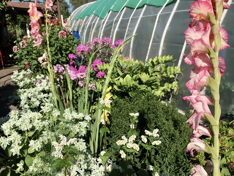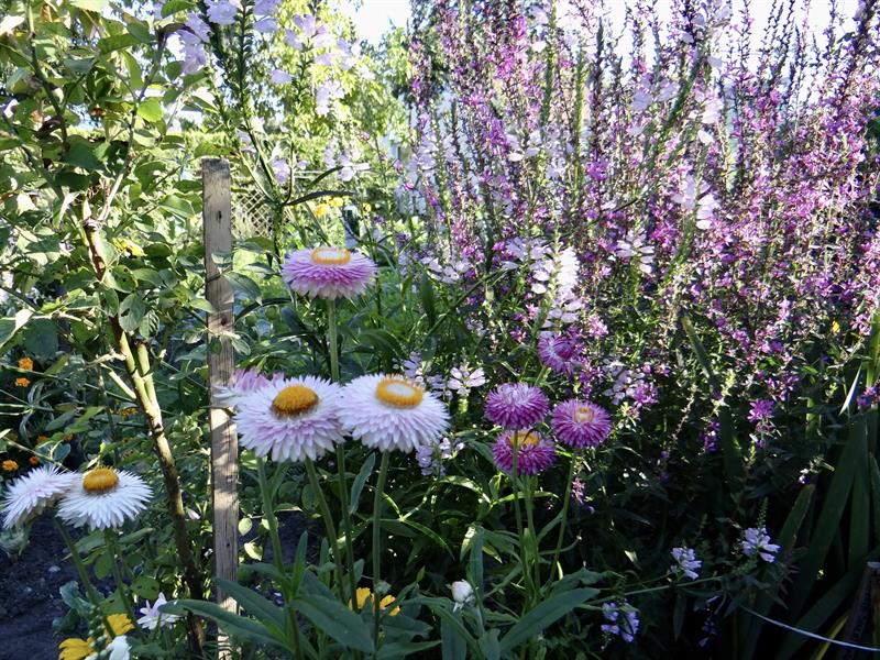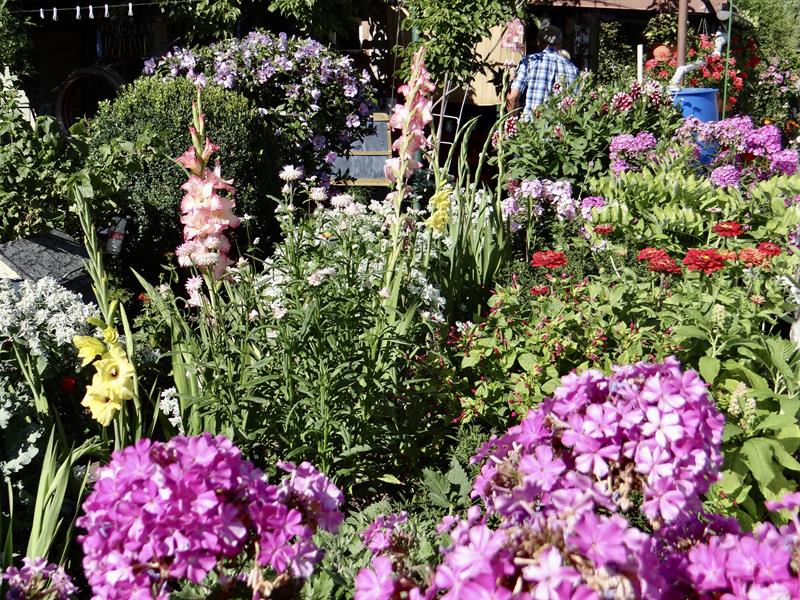 Nieco dalej ostróżki, cynie, wzdłuż głównej alejki powojniki, kobea, rudbekie, krwawniki, hortensje, pierisy, wilczomlecz. W innym miejscu rabata rozkwitająca daliami, liliami, mieczykami. Gdzie indziej rododendrony, piwonie i róże. To znów ślazy odcinające się na tle ściany kolb kukurydzy. Do tego kwiaty sezonowe jednoroczne w skrzynkach i donicach. W ogrodzie sporo jest ich zresztą własnego pomysłu pana Franciszka, w tym przerobiony stary babciny garnek, który służył do… wytapiania smalcu.