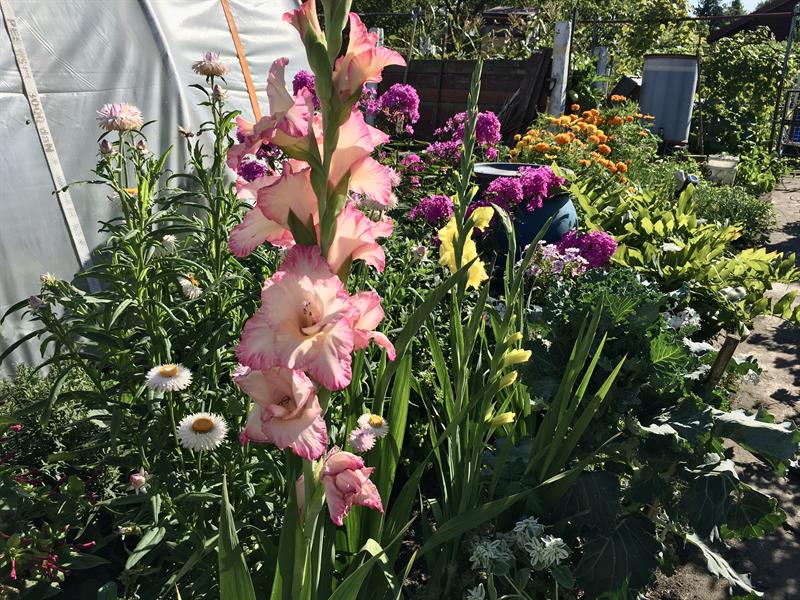 Od frontu, z alejki, wzrok zwykle przyciągają gigantyczne słoneczniki ozdobne. Z łodygami wzbijającymi się w niebo dominują na powitanie. W tym roku z uwagi na aurę nieco mniejszych rozmiarów. Im dalej, tym więcej na gości czeka niespodzianek w tej zacisznej enklawie.