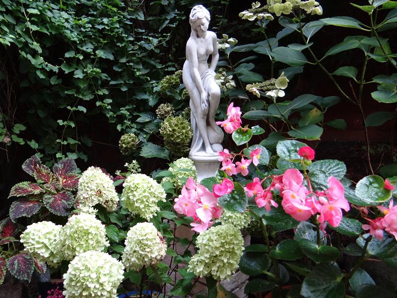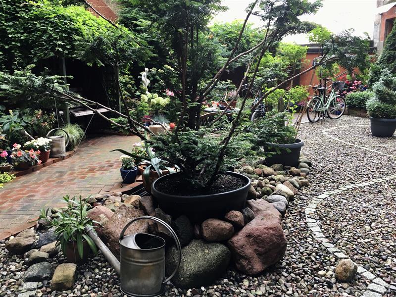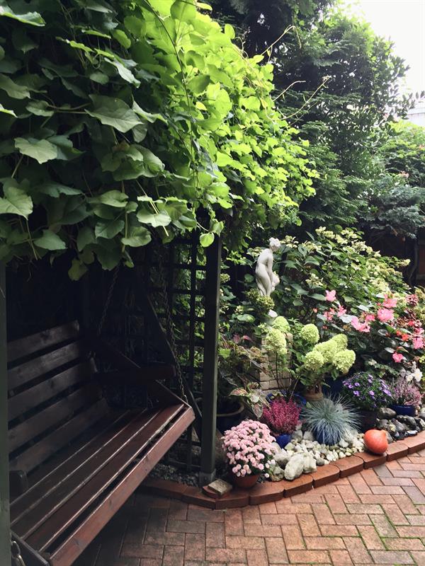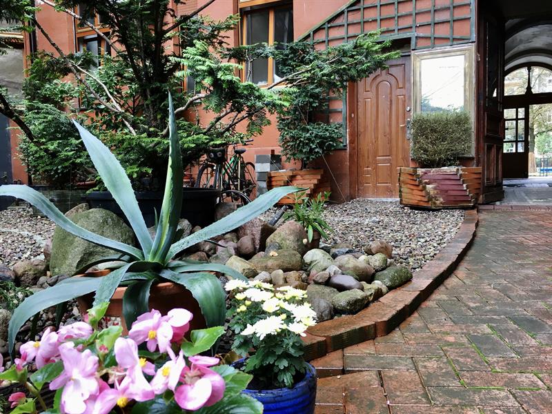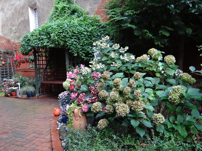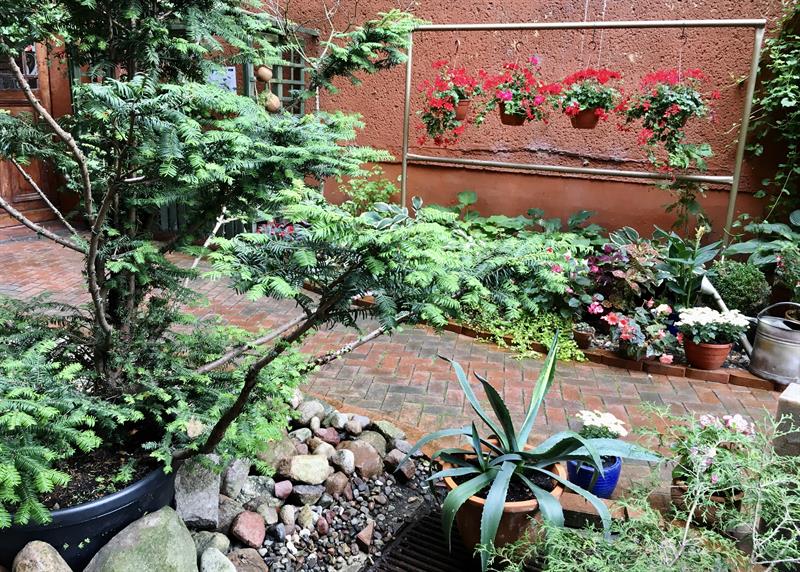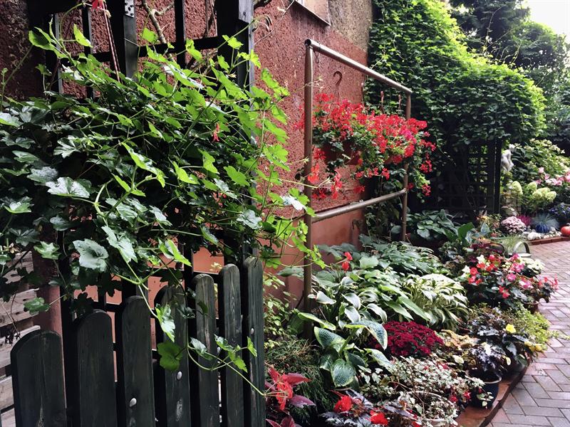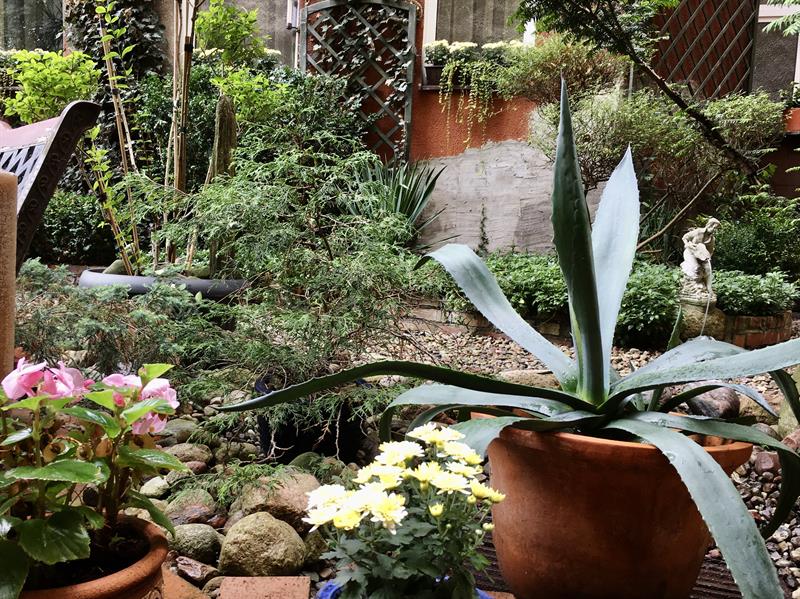 Tutaj słoneczne promienie docierają ledwie przez kilka godzin i nie więcej niż na trzy metry szerokim pasem do południa błądząc ledwie i nieśmiało po roślinach. Stąd też ich dobór, czyli w większości krzewy zimozielone i iglaki. Wkoło bujna zieleń w każdym zakątku przeplatana roślinami sezonowymi, jednorocznymi. Nowe zastosowanie w roli klombów z komarzycami mają tu stare, nieużywane już rowery, czy trzepak służący do zawieszania donic tym razem z czerwonymi pelargoniami. Tuż obok skryta pod zielonym baldachimem z liści rdestu huśtawka. Naprzeciwko odrapanej, z liszajami i obłupanymi kawałami tynku elewacji przesłaniające choć w części bluszcz oraz ściana zielonych nasadzeń i skrzynki na parapetach okien w parterze wypełnione astrami. Na schodach prowadzących do oficyny donice z begoniami. W innej części podwórka-ogrodu koleusy, funkie, fuksje, hortensje. A nieopodal stolika za jedną ławeczek potężna agawa na tle kamieni.