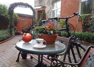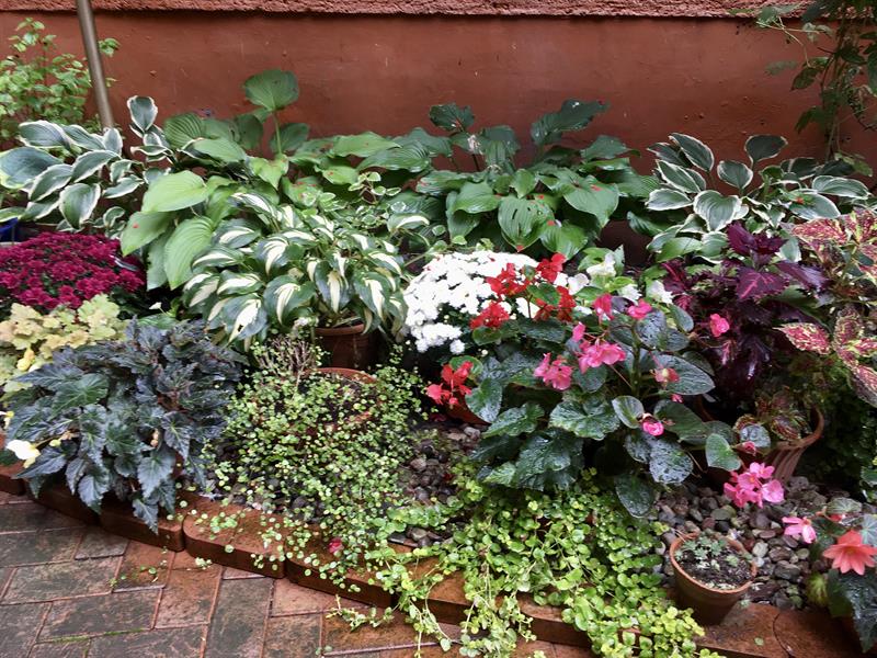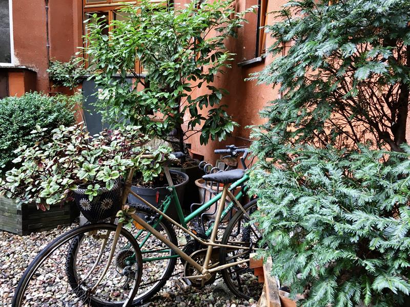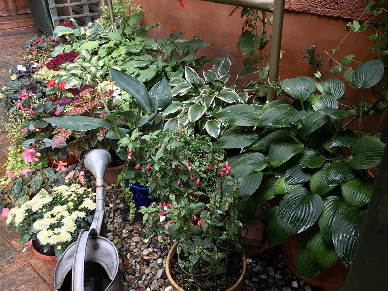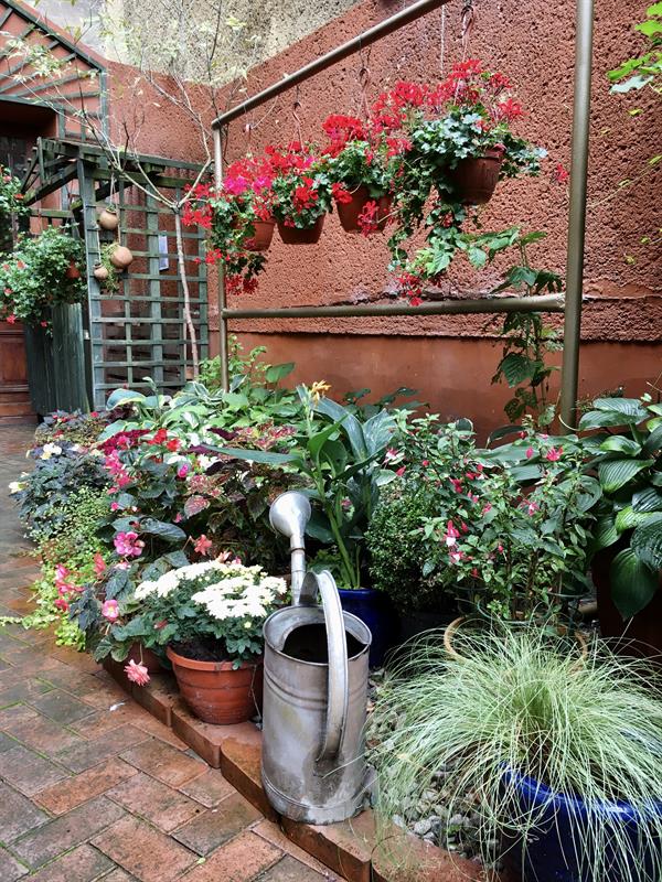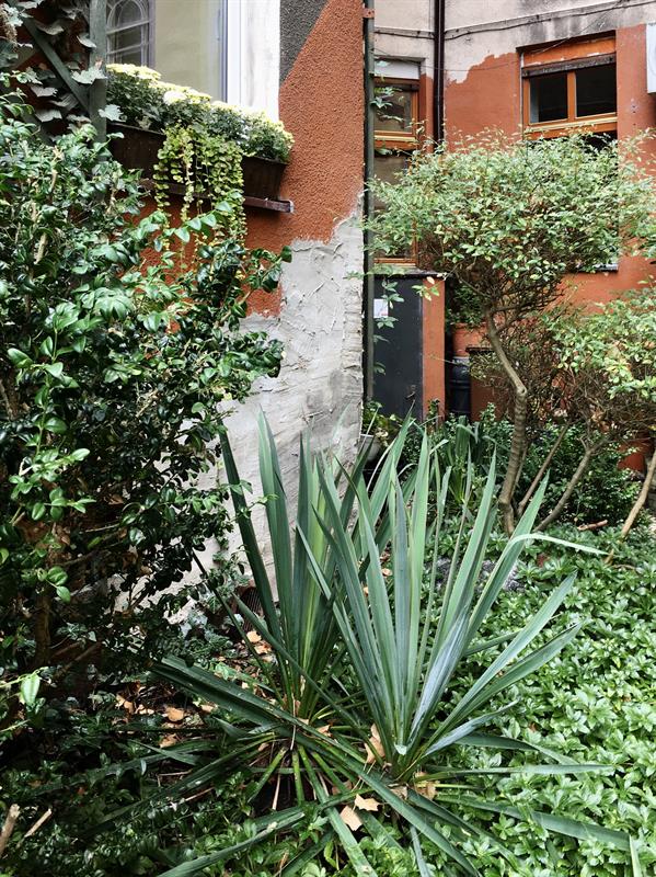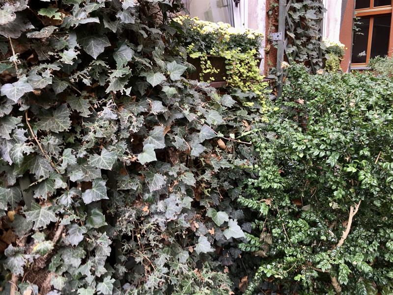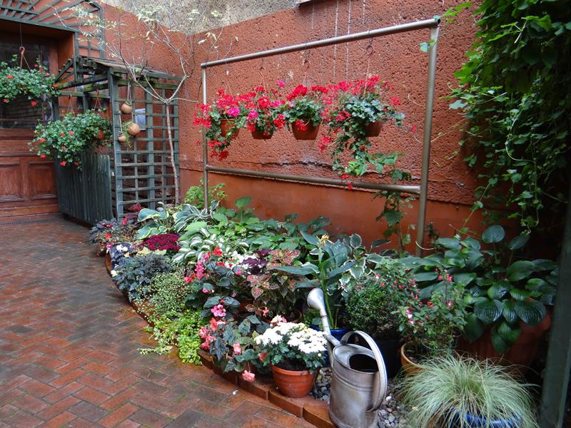 Tutaj słoneczne promienie docierają ledwie przez kilka godzin i nie więcej niż na trzy metry szerokim pasem do południa błądząc ledwie i nieśmiało po roślinach. Stąd też ich dobór, czyli w większości krzewy zimozielone i iglaki. Wkoło bujna zieleń w każdym zakątku przeplatana roślinami sezonowymi, jednorocznymi. Nowe zastosowanie w roli klombów z komarzycami mają tu stare, nieużywane już rowery, czy trzepak służący do zawieszania donic tym razem z czerwonymi pelargoniami. Tuż obok skryta pod zielonym baldachimem z liści rdestu huśtawka. Naprzeciwko odrapanej, z liszajami i obłupanymi kawałami tynku elewacji przesłaniające choć w części bluszcz oraz ściana zielonych nasadzeń i skrzynki na parapetach okien w parterze wypełnione astrami. Na schodach prowadzących do oficyny donice z begoniami. W innej części podwórka-ogrodu koleusy, funkie, fuksje, hortensje. A nieopodal stolika za jedną ławeczek potężna agawa na tle kamieni.