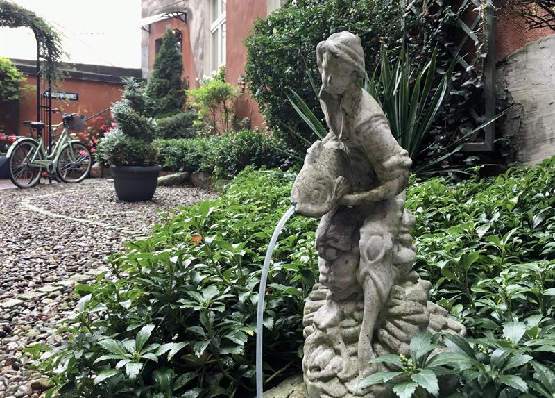 To miejsce wciąż się przeobraża. Stopniowo, rok po roku. I tak już od ponad dekady. Gdziekolwiek spojrzeć, to coś znów przykuwa wzrok. Raz jest nim stara ocynkowana konewka za ławeczkami i stolikiem. To znów mała fontanna z kamienia w kształcie figurki chłopca z rybką na styku murku z przedwojennej cegły i odcinającego się wyraźnie od niego pasa przestrzeni wysypanej kamykami. Innym razem intryguje skryta nieco wśród zieleni krzewów parka przytulających się i w geście pocałunku postaci. Cherubinki wtulone w siebie i między trzmieliny. A nieopodal stojak na rowery, oczywiście użyteczny, a wykonany z nikomu już niepotrzebnego fragmentu okiennej ozdobnej kratownicy. To znów rzeźba Wenus oblewana ostatnimi promieniami przedpołudniowego słońca na skarpie. A w tle, idąc dalej wzdłuż ścieżki, kwitnąca na pomarańczowo „ściana” milinu amerykańskiego, prezent sprowadzony aż z Grecji. Obrazy zmieniają się jak w kalejdoskopie, w zależności od miejsca, z którego patrzymy.