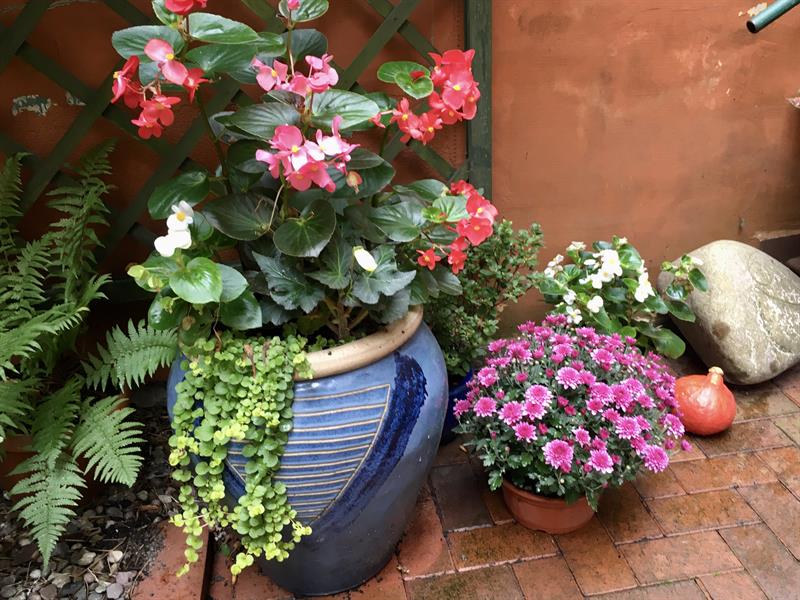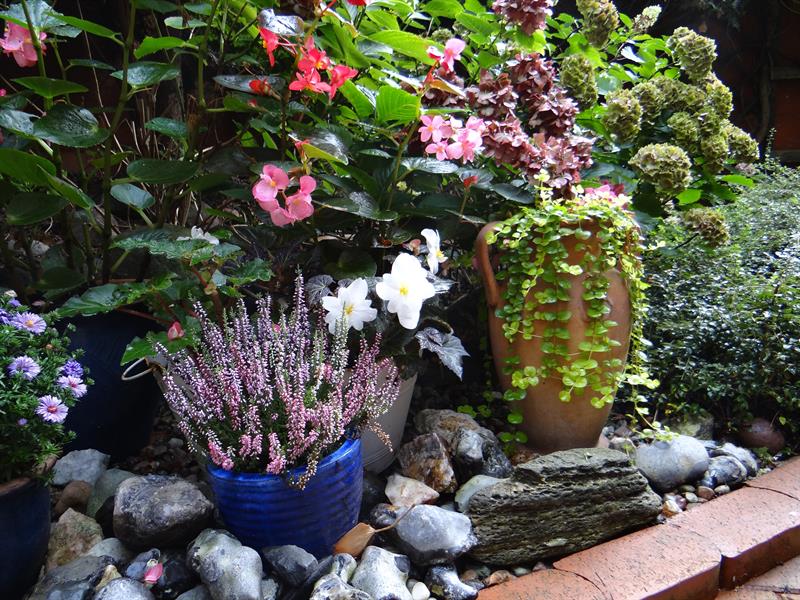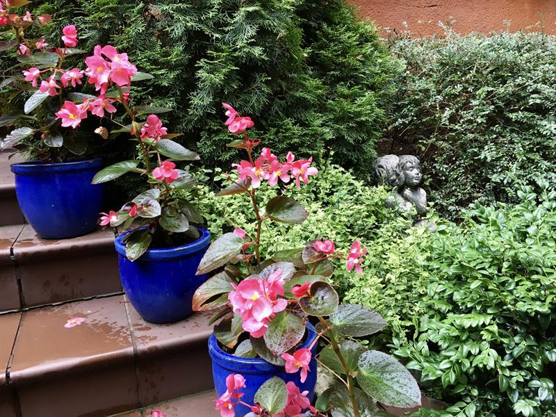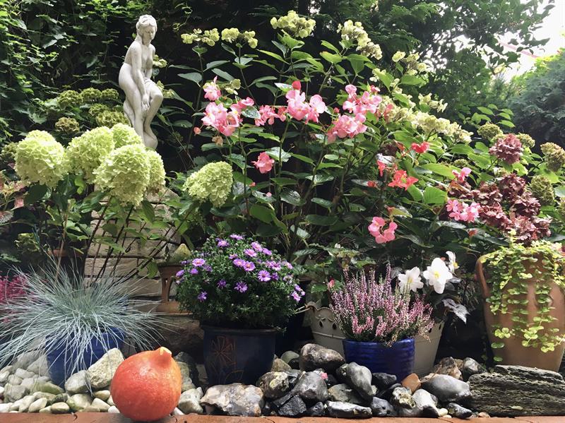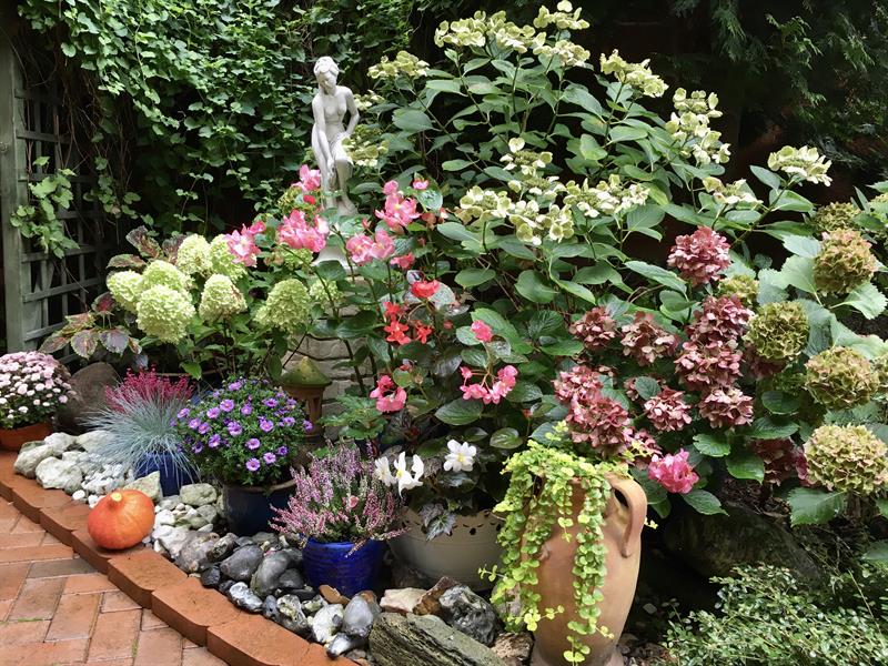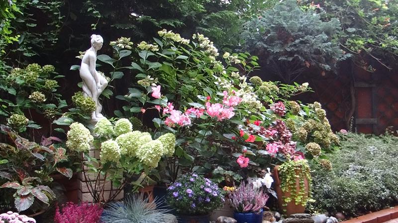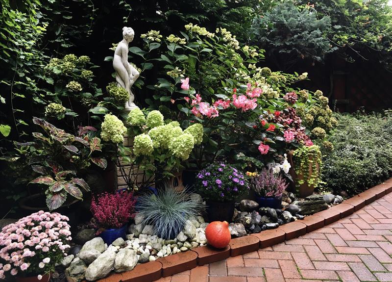 Uwagę przyciągają kolejne bujnie rozkrzewiające się ligustry, trzmieliny i żywotniki, a także hosty, bukszpany. Żywotniki i bukszpany urosły już na tyle, że dają się ciekawie formować. Przez część podwórkowego ogrodu pan Zbigniew poprowadził dwie kamienne ścieżki, czerpiąc inspirację z jednego z przesłań filozofii Wschodu. Inną z nowości w stale zmieniającej się, kreowanej przez niego zielono-kwiatowej enklawie, ale zakładaną na stałe, są lustra, które optycznie powiększają i wzmacniają efekt przestrzenny.