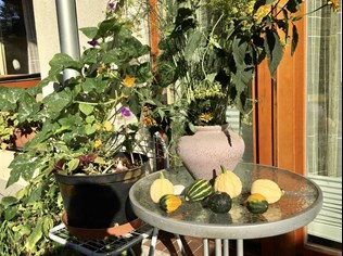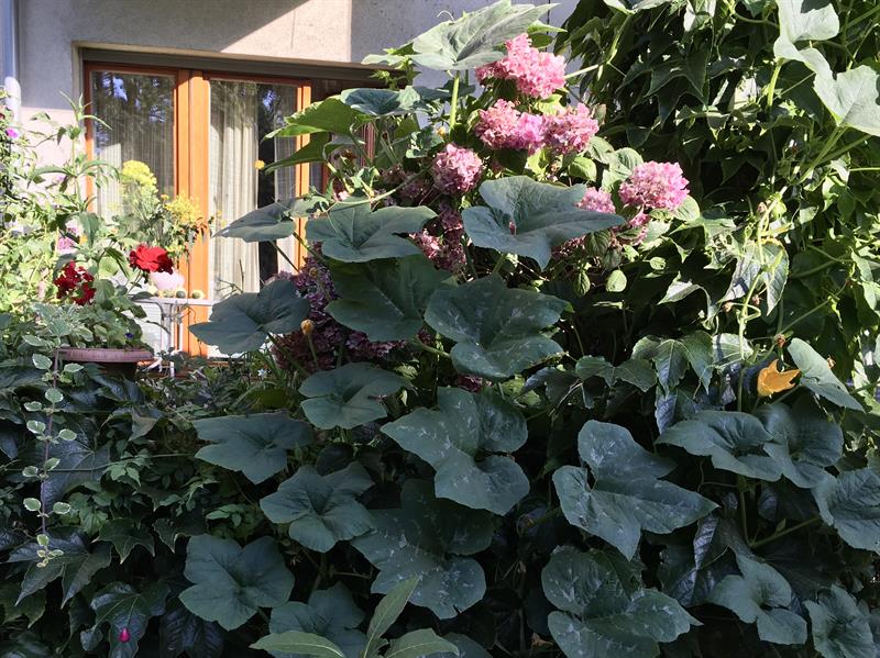 I dynie w różnych odmianach. Spod ich liści przebijają się różowe kwiatostany hortensji. A to dlatego że właśnie dynie obrodziły w tym roku wyjątkowo obficie. Stworzyły ze swych dużych dekoracyjnych liści niemal sporych rozmiarów zielony zagajnik. Pierwsze z nich plony już od jakiegoś czasu są zresztą ozdobą w kąciku wypoczynkowym pani Jolanty na tarasie. Konkretnie na ogrodowym stoliku, przy którym można przysiąść i napawać się przyrodą w naturze, popijając niespiesznie herbatę lub kawę. ©℗