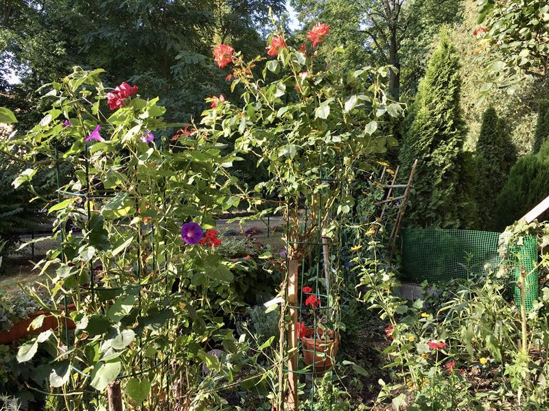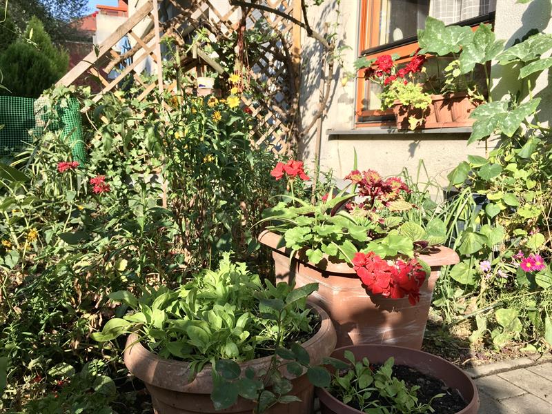 Rośnie więc i szałwia, i mięta, i rozmaryn. Do tego tymianek, szpinak, koper, pietruszka, szczypiorek na wiosnę, pomidory, a nawet ziemniaki. Oczywiście są i rośliny ozdobne. Krzewy róż, w których buszują ptaki. Jest i powojnik. W innym miejscu bluszcz. Gdzie indziej zaś milin na pergoli. W donicach pelargonie.