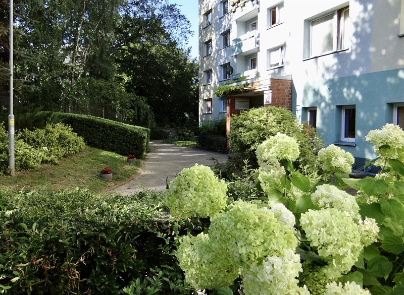 Jak wspomina Maria Myśliwiec, zaczynali od zera. Zdecydowali się wzięć sprawy w swoje ręce , aby móc żyć w miejscu, do którego wraca się z przyjemnością. Po wyczerpującym szpitalnym dyżurze. Krok po kroku zagospodarowywali otoczenie. Tam, gdzie teraz jest parking było klepisko. Zaniedbane trawniki zaczęli przemieniać w wielobarwne klomby i rabaty. W kolekcji przyblokowych nasadzeń wraz z wiśniami znalazły się też kaliny koralowe czy pęcherznice. W różnym stanie część nasadzeń przetrwała, inne nie. To uboczny skutek niezbędnych prac modernizacyjnych przy elewacji, czy wymianie na nową instalacji w węźle cieplnym SEC. Zestaw roślin w miarę możliwości i środków jest uzupełniany.