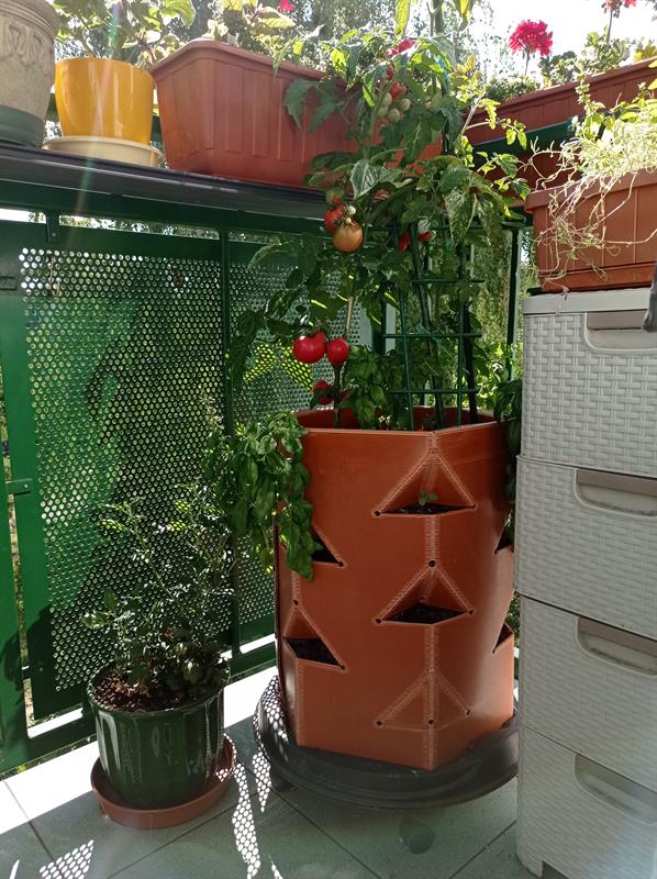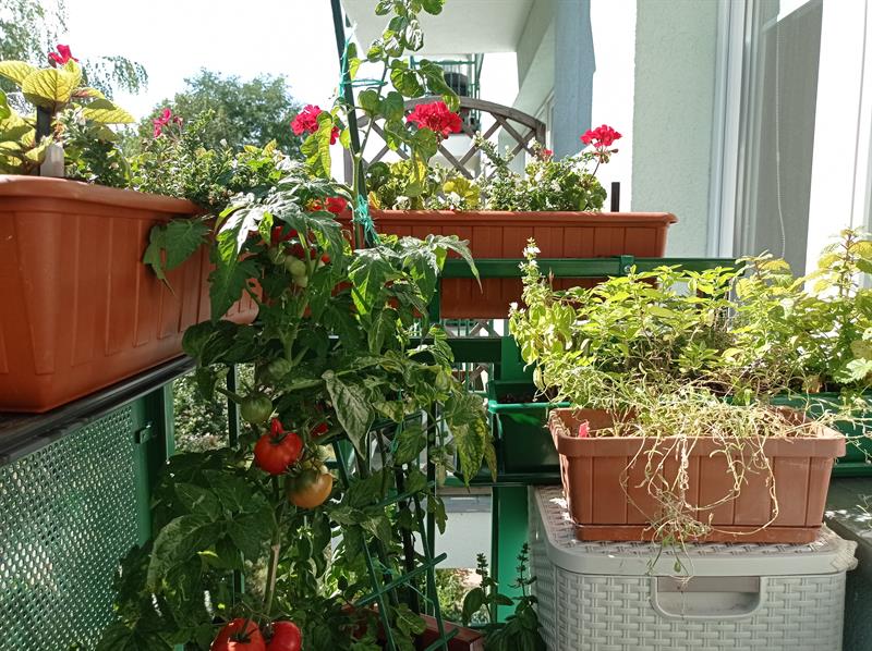 Po bokach w donicach bieli się bakopa, a tuż obok niej puszą się czerwone pelargonie. Są też te w kolorze różowym i komarzyce z własnej rozsady. Do tego skrzynka maciejki, która - o dziwo - doskonale przezimowała - i raczy panią Wiesławę, jak i pozostałych domowników, swoim zapachem. Są i dostojne dwa krzewy paciorecznika o pięknych i okazałych kwiatach w kolorach żółtym i czerwonym. Znalazło się też miejsce na minizielnik z bazylią, tymiankiem i melisą, a w praktycznej, bo składanej, jednej z donic właśnie dojrzewają koktajlowe pomidory. ©℗