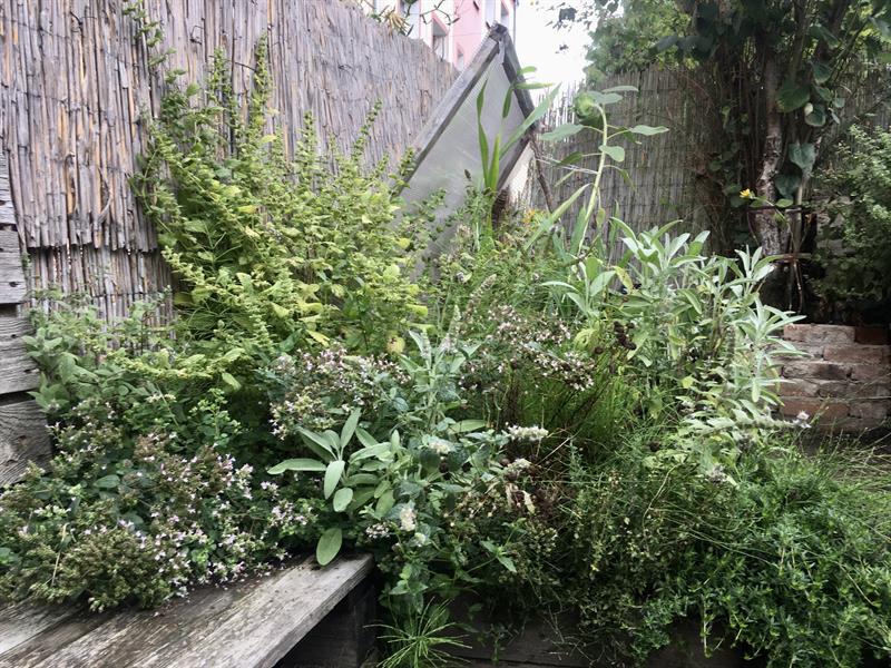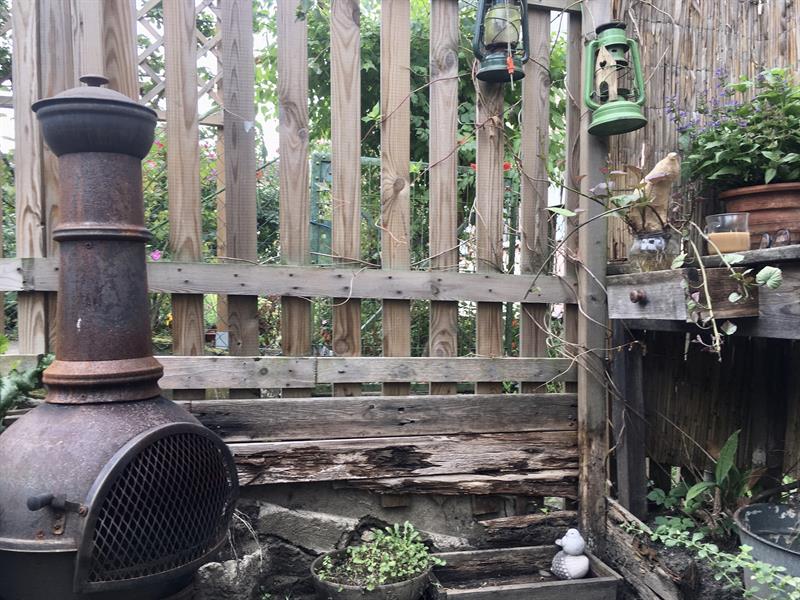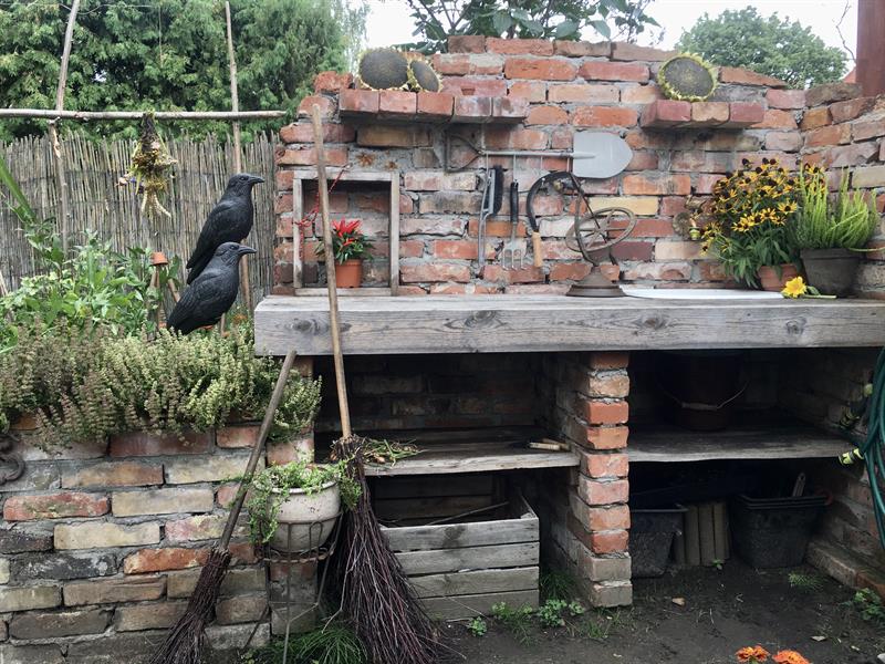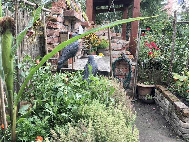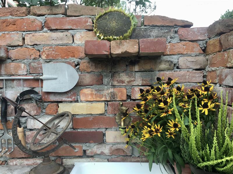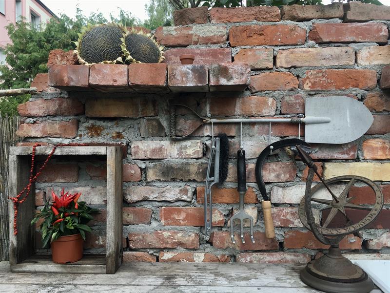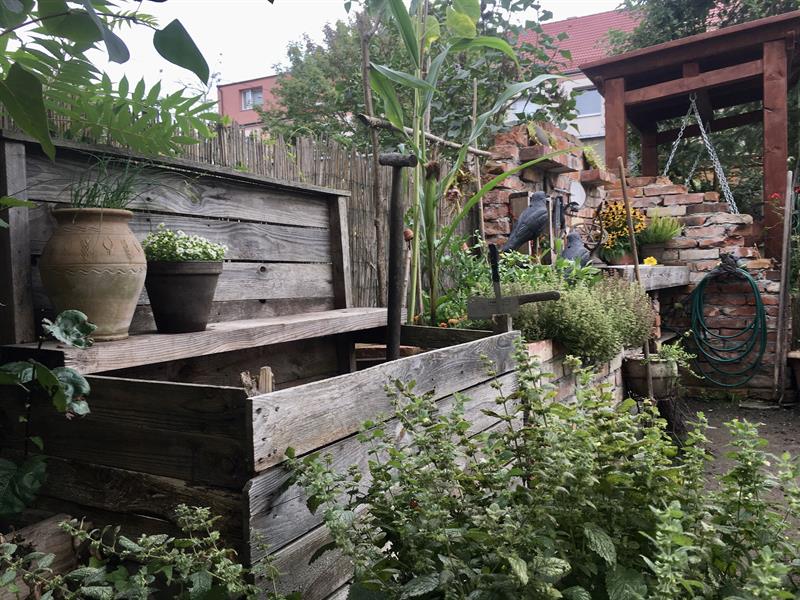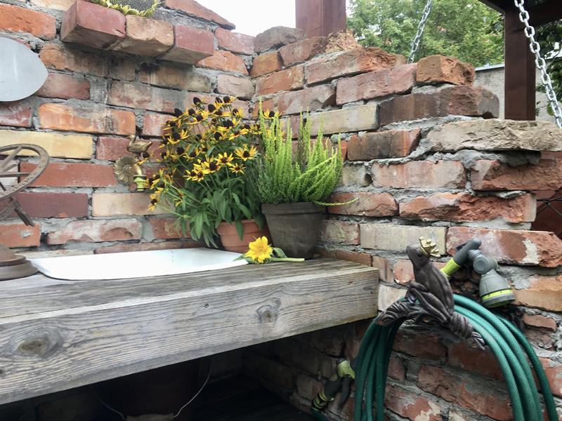 Założenie było takie, żeby nie wydawać w ogóle pieniędzy, a jeśli już będzie trzeba, to by były to wydatki jak najmniejsze. Stąd praktycznie wszystkie elementy miniogródka pochodzą z odzysku, z drugiej ręki, jak wspomniane właśnie cegły, deski czy palety (jedna z nich doskonale sprawdza się teraz w roli siedziska przy stoliku). Inne, jak kanki, wiadra, garnki czy donice, które inni wyrzucili już na śmietnik, odnalazły tutaj nowe przeznaczenie – we wszystkich coś rośnie. Z aukcji internetowej zaś do przydomowego miniogródka trafił żeliwny zlew, przydatny do omycia rąk czy opłukania z ziemi warzyw.