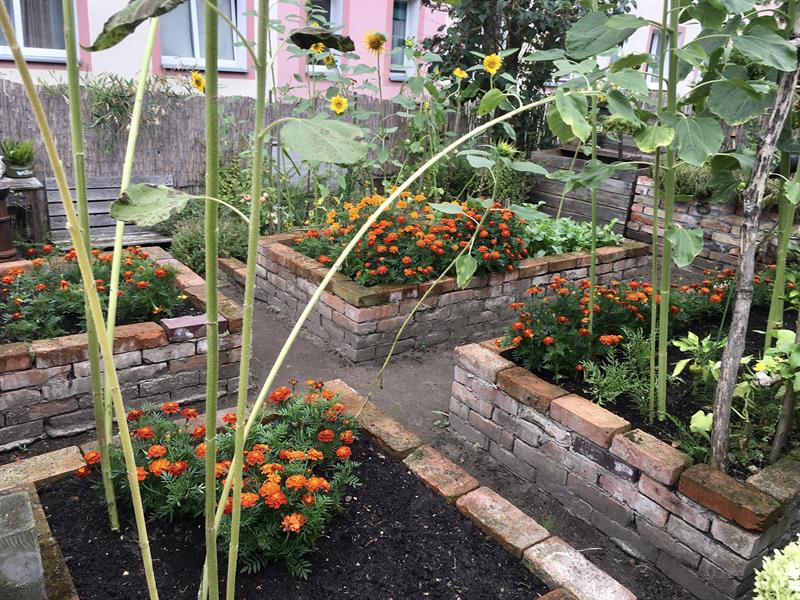 Kwiaty w miniogrodzie p. Czerwonków to tylko skromny dodatek. Z tych najważniejszych są te użyteczne i efektownie prezentujące się na grządkach z cegły, a przy okazji odstraszające skutecznie wszelkie szkodniki aksamitki. Zjawiskowo prezentują się też dojrzewające właśnie pod koniec lata w dużej liczbie słoneczniki. ©℗