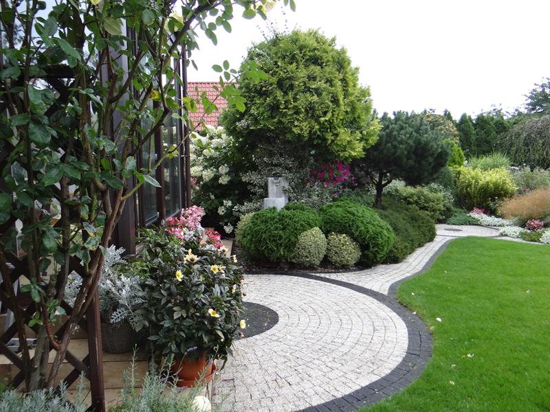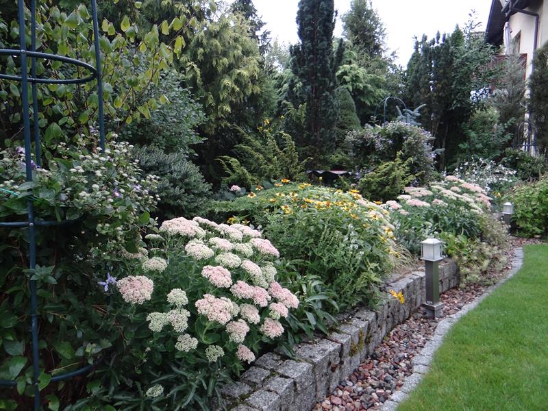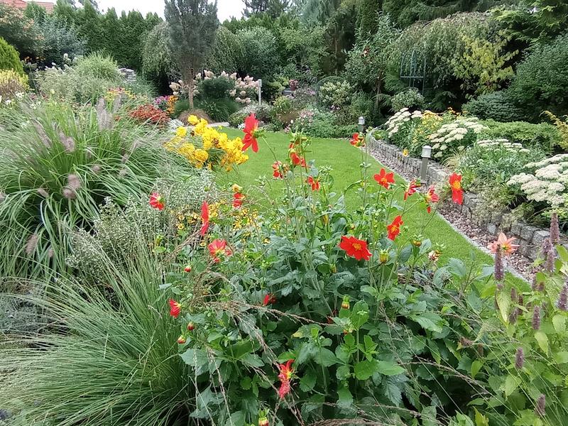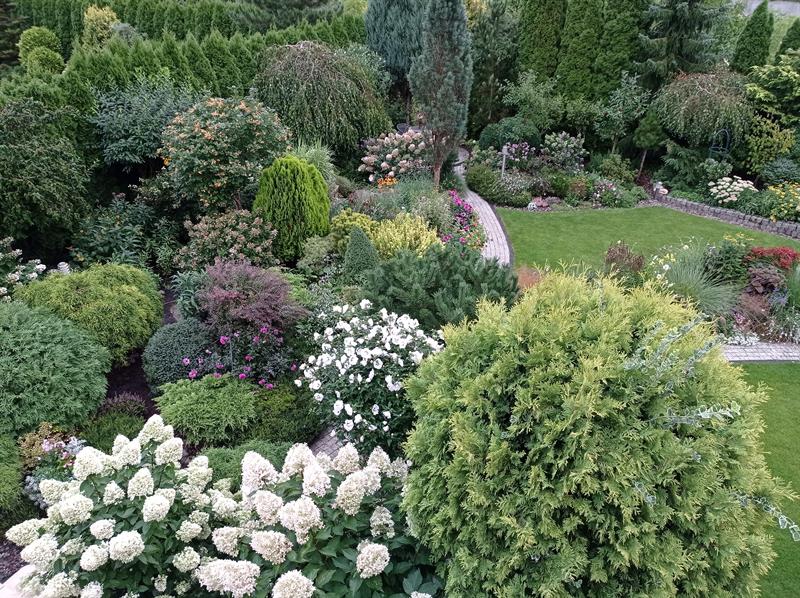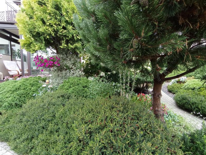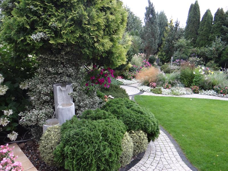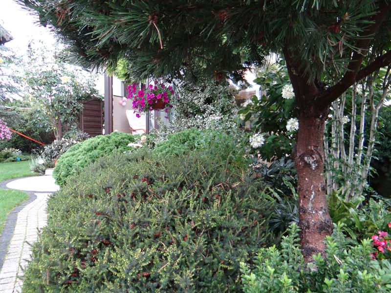 Na tle świerków, sosen, cyprysików, tuj i jodeł, laurowiśni, bukszpanów, berberysów i okazów choiny kanadyjskiej nie sposób nie dostrzec o różnym ubarwieniu i pokroju liści trzmielin, traw ozdobnych, starców popielnych zwanych też mrozami, dalii, szałwii omączonej, powojników bylinowych, czy ścielących się u stóp dywanowo smagliczek oraz strzelistych werben patagońskich. W kolekcji tej jest gaura wdzięczna, jedna z ulubionych pani Danuty, której kwiaty w kłosach dają wrażenie zwiewnej mgiełki, czy kępy żółcących się rudbekii i dzielżanów. Do rabat i kaskad wodnych prowadzą meandrujące alejki, a taras okalają róże oraz w donicach i w amplach podwieszanych drobnokwiatowe begonie. Z boku domu udało się wygospodarować pas ziemi pod minisad, a w innym miejscu mały warzywnik. Całości zaś dopełniają dwie wodne kaskady. ©℗