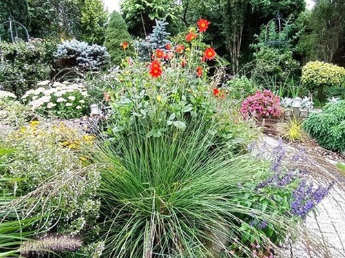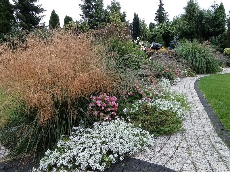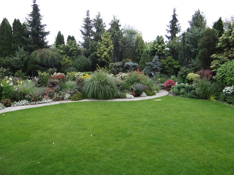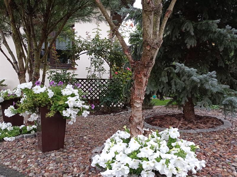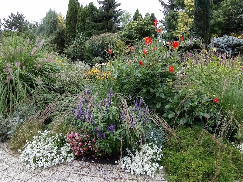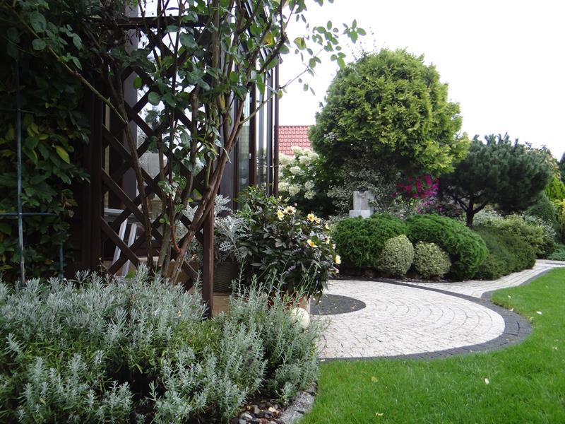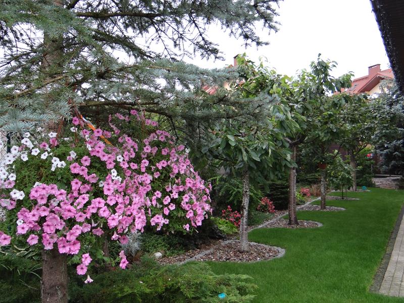 Na tle świerków, sosen, cyprysików, tuj i jodeł, laurowiśni, bukszpanów, berberysów i okazów choiny kanadyjskiej nie sposób nie dostrzec o różnym ubarwieniu i pokroju liści trzmielin, traw ozdobnych, starców popielnych zwanych też mrozami, dalii, szałwii omączonej, powojników bylinowych, czy ścielących się u stóp dywanowo smagliczek oraz strzelistych werben patagońskich. W kolekcji tej jest gaura wdzięczna, jedna z ulubionych pani Danuty, której kwiaty w kłosach dają wrażenie zwiewnej mgiełki, czy kępy żółcących się rudbekii i dzielżanów. Do rabat i kaskad wodnych prowadzą meandrujące alejki, a taras okalają róże oraz w donicach i w amplach podwieszanych drobnokwiatowe begonie. Z boku domu udało się wygospodarować pas ziemi pod minisad, a w innym miejscu mały warzywnik. Całości zaś dopełniają dwie wodne kaskady. ©℗