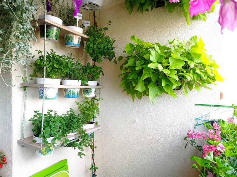W jednym z narożników przy ścianie jest zgrabna konstrukcja z deseczek na linach. To z kolei kącik warzywno-zielarski z półeczkami na donice. A tuż obok pod powałą kołysze się donica z owocującą długo odmianą truskawki. Na jednym parapecie pysznią się zwykle papryczki i koktajlowe pomidorki, na drugim donice z okazami begonii w trzech kolorach i dwa krzewy sundevilli. Do tego dwa krzesełka i stolik, czyli skrojony na miarę kącik wypoczynku. W przeciwległym narożniku znajduje się zaś niewielka fontanna dyskretnie przesłonięta tym razem dorodnymi okazami żółcących się w donicach rudbekii. A to wszystko otoczone dodatkowo girlandami ze wspomnianych surfinii nad głowami i zwisającymi warkoczami dichondry srebrzystej, tworzących wspaniały baldachim chroniący przed nadmiarem promieni słońca i dający w ich cieniu wytchnienie. ©℗