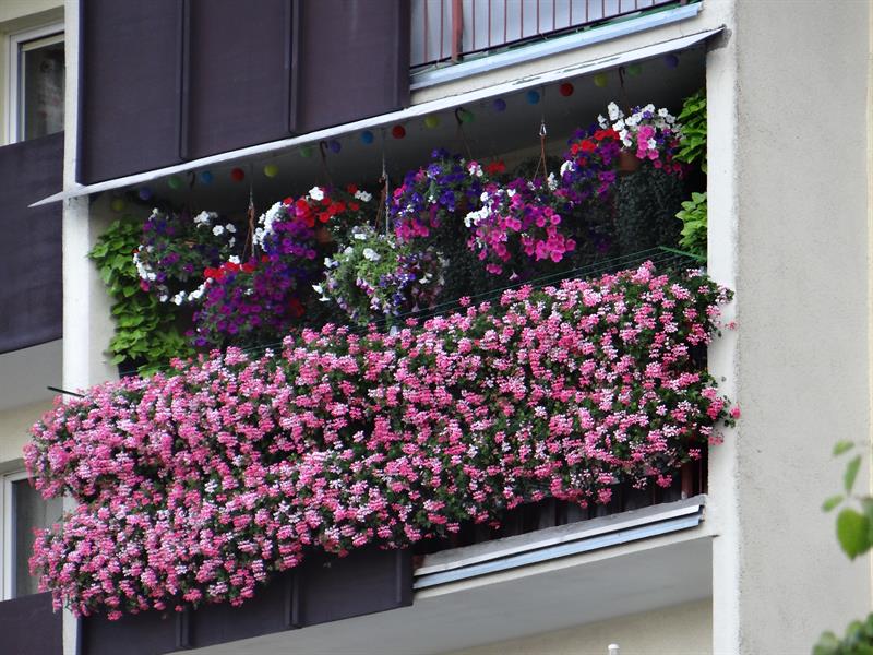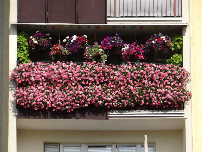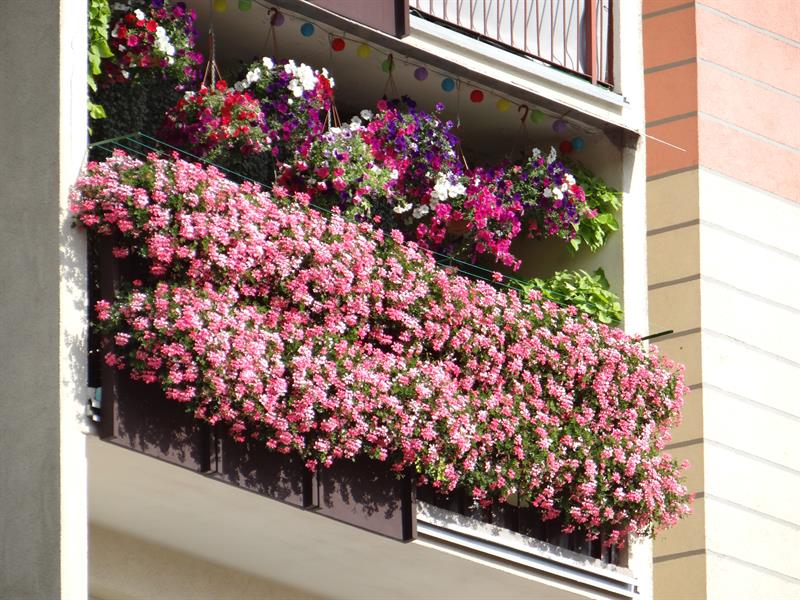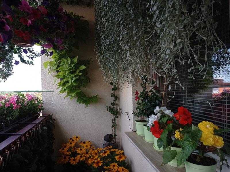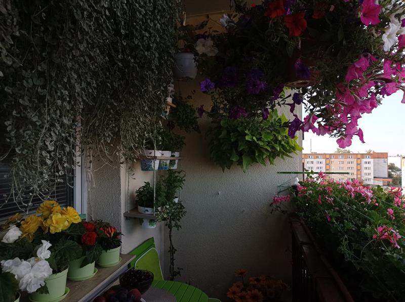 Okna ich mieszkania na czwartym piętrze w bloku wychodzą na zachodnią stronę osiedla z widokiem na pobliską halę widowiskowo-sportową, ale ta, ze swym betonowym placem, to zaprzeczenie niewielkiej przestrzeni balkonu skąpanego kaskadą z pelargonii, odmian o różowych i czerwonych kwiatach, okrywających niemal szczelnie od frontu balustradę. Nie inaczej jest i w tym roku. To kwiaty wdzięczne, o wyjątkowych walorach dekoracyjnych, a w dodatku – co nie bez znaczenia – doskonale znoszące warunki klimatyczne na wysokościach i z racji usytuowania samego balkonu. Odporne na częste wiatry, a w ostatnich latach także wyjątkowo długie okresy suszy i promienie palącego słońca, kiedy na termometrze w najgorętszych porach dnia, popołudniami, zaczyna już brakować skali. Tworzą naturalną zaporę, podobnie jak wielokolorowe surfinie w donicach podwieszanych do sufitu.