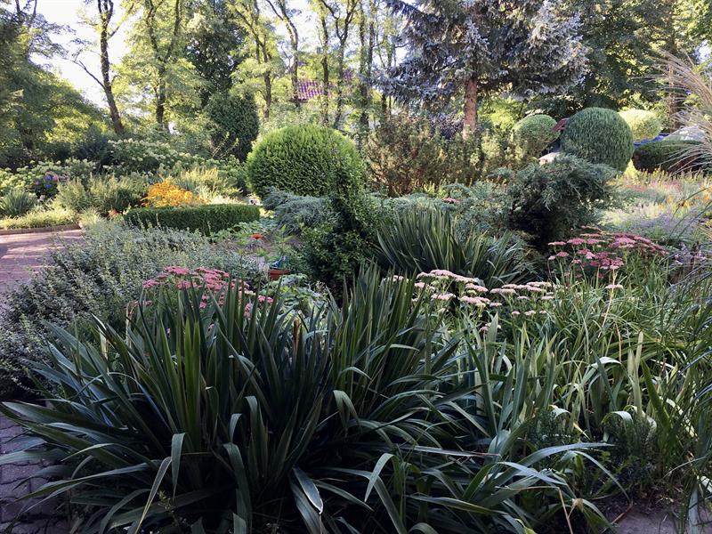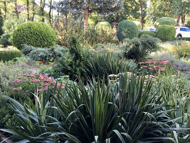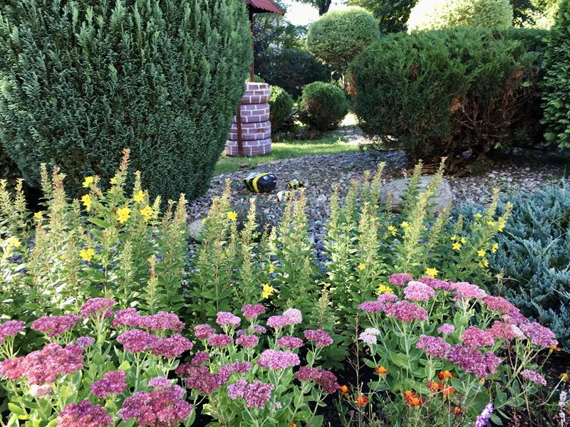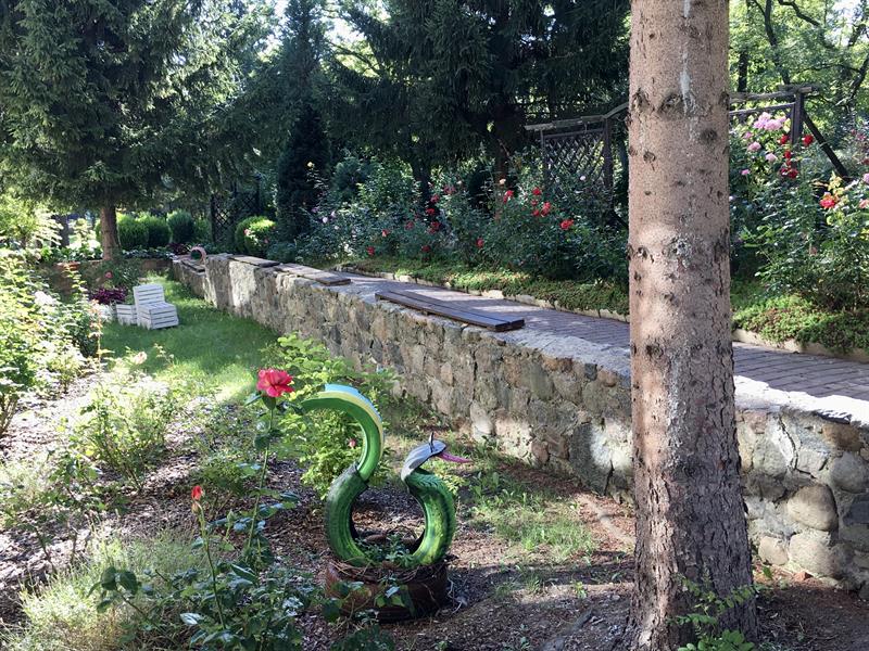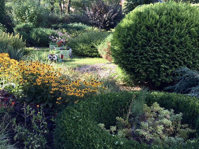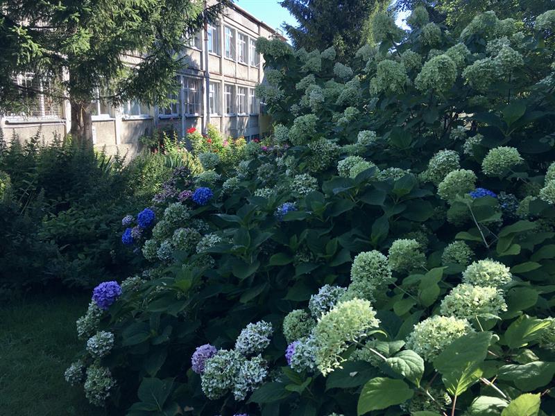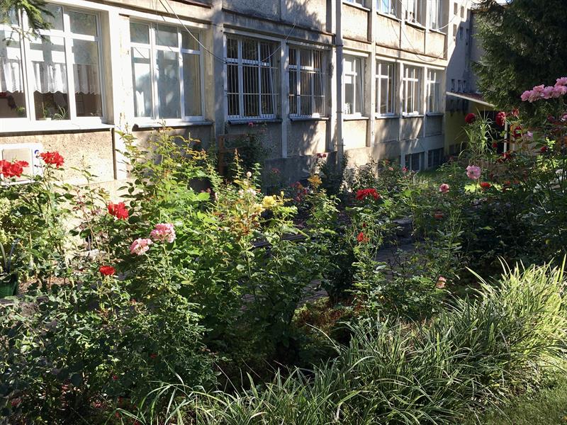 Są więc tam miejsca tematyczne: z ozdobnymi trawami, z hortensjami, wypełnione strzyżonymi w finezyjne kształty, w stożki i w kule iglakami, rododendronami i azaliami, a także okazałe rosarium z licznymi odmianami krzewów róż. Te ostatnie rosną tuż przy budynku szkoły i wzdłuż alejki przy pergolach, która prowadzi do niewielkiego wzniesienia, gdzie urządzona została klasa plenerowa - zadaszona, z ławami i siedziskami. A wszystko to w pieczy Iwony Muszyńskiej, szkolnej specjalistki odpowiedzialnej za przyszkolne tereny zielone.