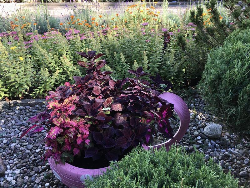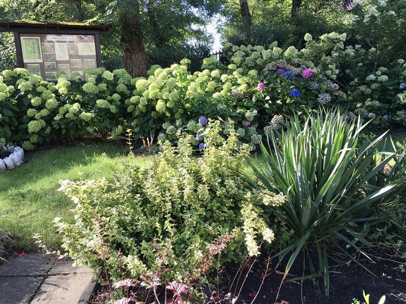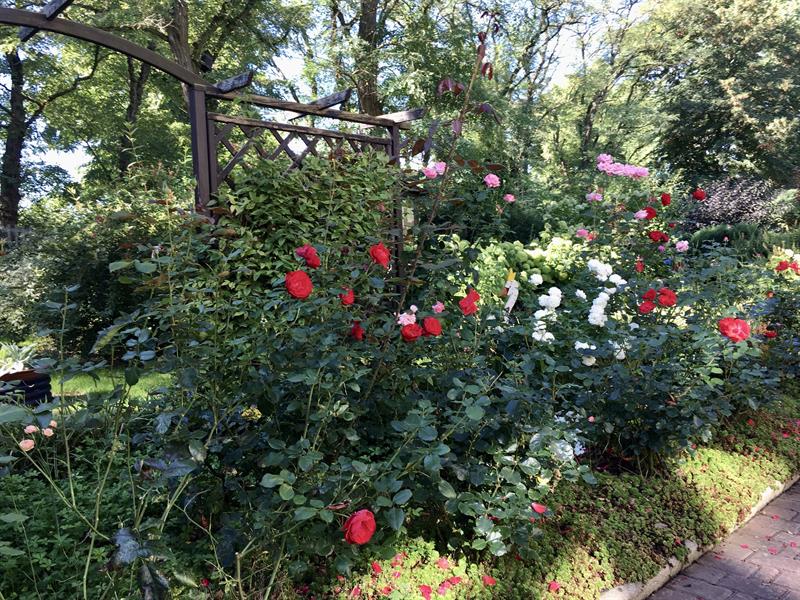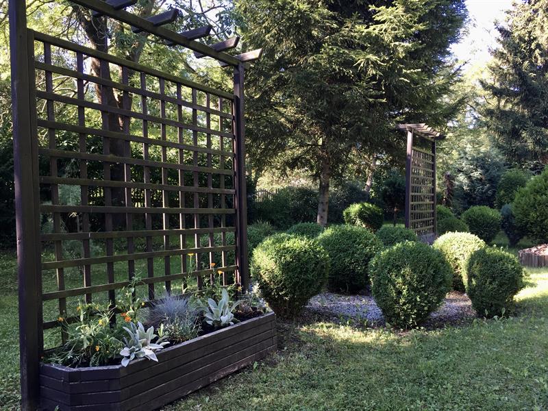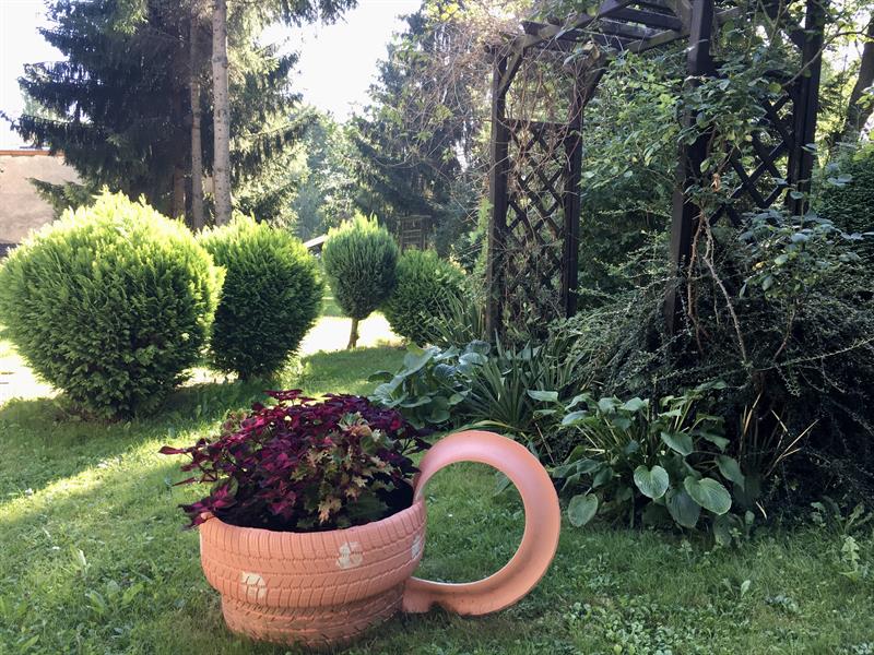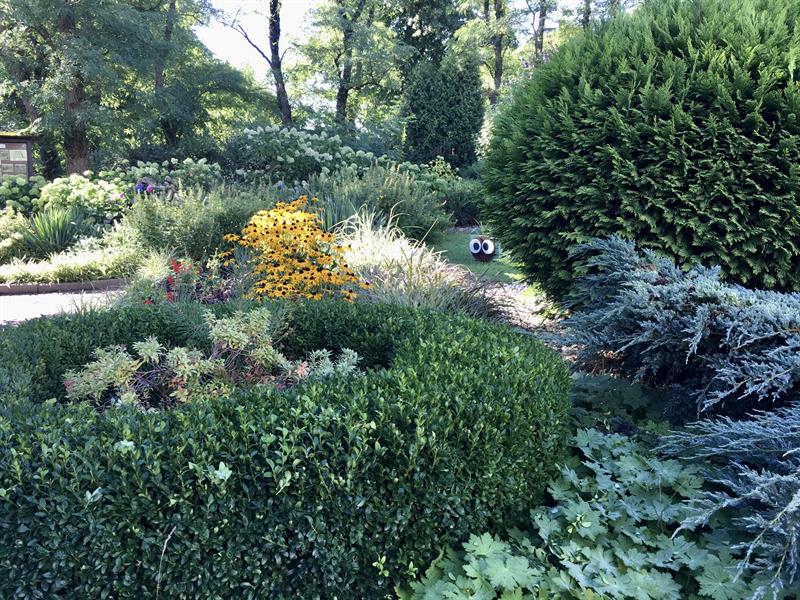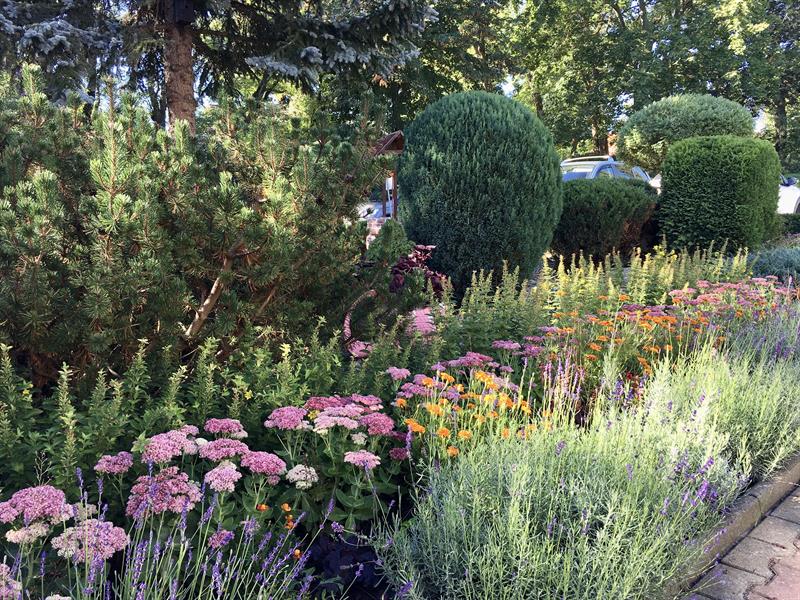 Są więc tam miejsca tematyczne: z ozdobnymi trawami, z hortensjami, wypełnione strzyżonymi w finezyjne kształty, w stożki i w kule iglakami, rododendronami i azaliami, a także okazałe rosarium z licznymi odmianami krzewów róż. Te ostatnie rosną tuż przy budynku szkoły i wzdłuż alejki przy pergolach, która prowadzi do niewielkiego wzniesienia, gdzie urządzona została klasa plenerowa - zadaszona, z ławami i siedziskami. A wszystko to w pieczy Iwony Muszyńskiej, szkolnej specjalistki odpowiedzialnej za przyszkolne tereny zielone.