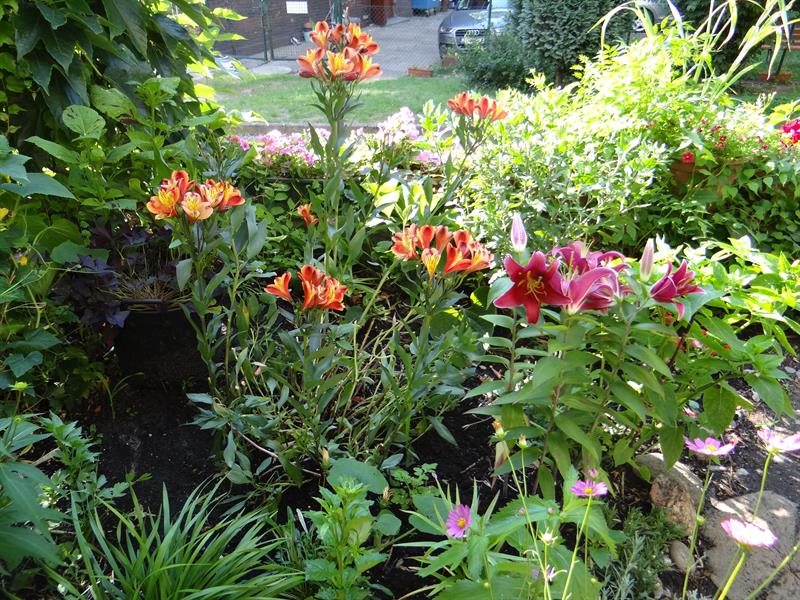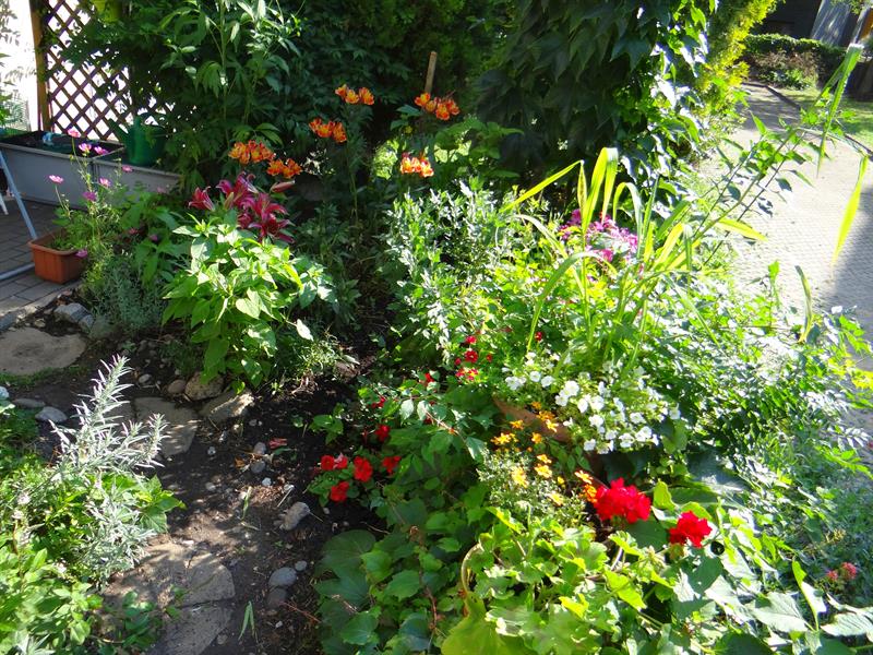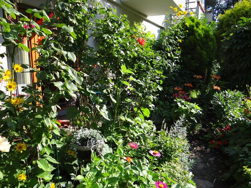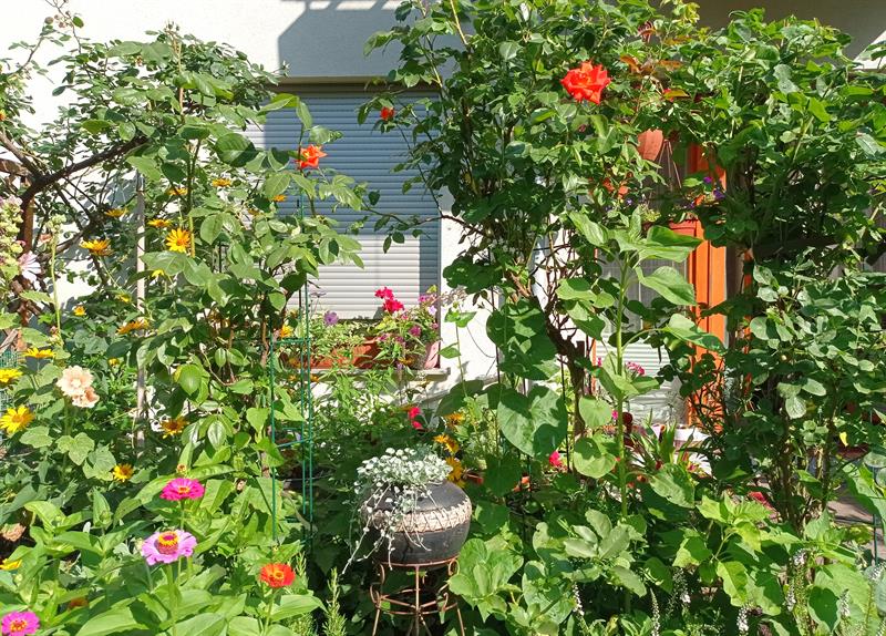 Pośród kwiatów nie brak ziół: szałwii, mięty, rozmarynu, majeranku, tymianku. Jest też skrzynkowa rabatka naciowej pietruszki. Gdzie indziej uśmiecha się okazały ogórek, a nawet truskawka. W donicach pelargonie. W innym z zakątków lilie, kalie i gipsówka, astry, cynie, malwy, ślazy, maciejka, koleusy, dziwaczki, oleander, bieluń, dichondra srebrzysta, przetykane żółcącymi się dzielżanami. A w honorowym miejscu słoneczniczki. Te ostatnie jako wspomnienie z rodzinnego ogrodu z dzieciństwa z Wilna. ©℗