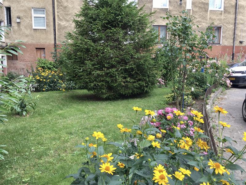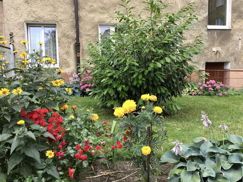 Od podwórza na skrawkach ziemi nie brak też hortensji, liliowców, okazałych i rozłożystych funkii w kilku odcieniach zieleni i o różnorodnym pokroju liści. Różano-hortensjowe rabaty, które otaczają zieleniec, przetykane są dziwaczkami, mieczykami, ostróżką, słonecznikami, aksamitkami, ślazami, rumiankami, rudbekiami, dzielżanami. Tu i tam zamajaczy znów strzelista malwa. Kiedy nadchodzi wiosna rozkwitają dla odmiany tulipany, żonkile, cesarskie korony, a w przestrzeni obsianej trawą dominują krokusy. Dopełnieniem pejzażu są rosnący pośrodku dorodny świerk i trzy laurowiśnie. W tej niewielkiej przestrzeni udało się nawet wygospodarować kącik pod zielnik, z którego każdy może częstować się choćby aromatyczną miętą.