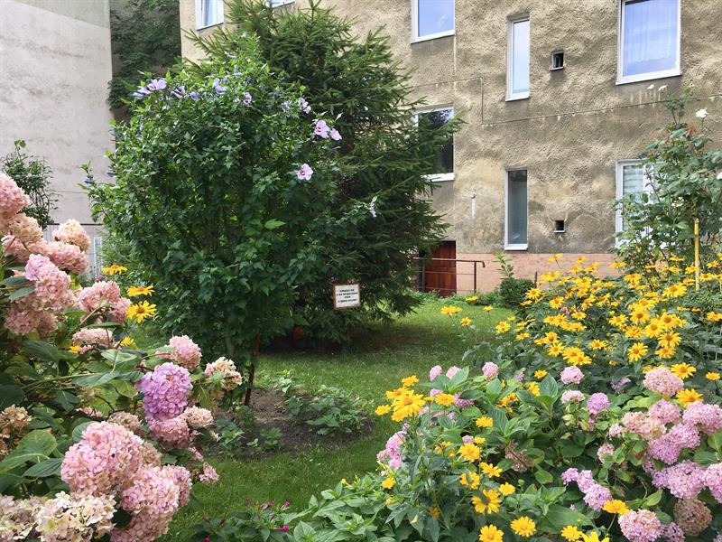 Wśród krzewów róż są więc rabatowe, okrywowe, pienne, wielko- i drobnokwiatowe, szlachetne stare odmiany oraz współczesne hybrydy. Jedne pięknie pachną, a inne są tylko piękne dla oka. I ukochane opiekuna tej enklawy: herbaciane. Tam też znalazło się miejsce na miejski hotelik dla pszczół. Z kwitnących tu wielu roślin mogą czerpać nektar. Jest też dla nich schronienie na zimę.
