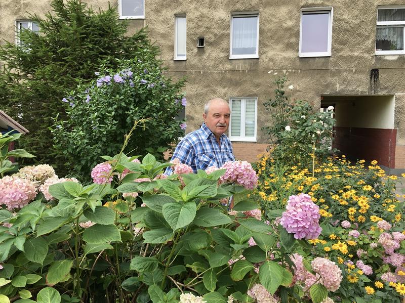 Zawodowo związany był z koleją. Po przejściu na emeryturę dzieli wolny czas między te przydomowe rabaty i rodzinną działkę, z której w otoczenie bloku przy ul. Legionów Dąbrowskiego trafiało i wciąż trafia wiele roślin.