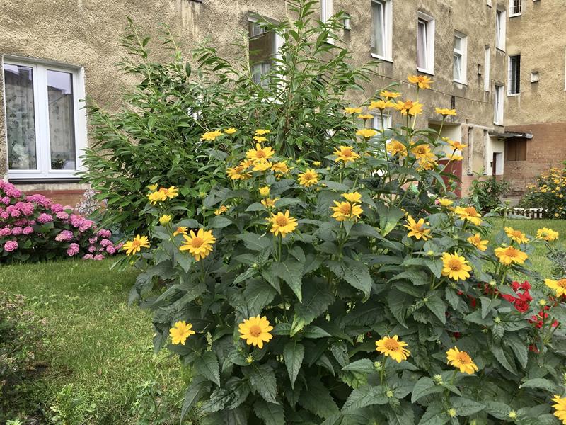– Zaczęło się od róż, potem doszły kolejne rośliny, w tym flance z upraw działkowych, jak krzewy hibuskusa. Ten, który rośnie wciąż w podwórzu, jest niezwykły, bo dwubarwny, jego kwiaty zakwitają na fioletowo i na biało. To taki dość nieoczekiwany efekt moich szkółkarskich eksperymentów – uśmiecha się pan Franciszek dumny z efektu, który może też teraz cieszyć pozostałych mieszkańców.