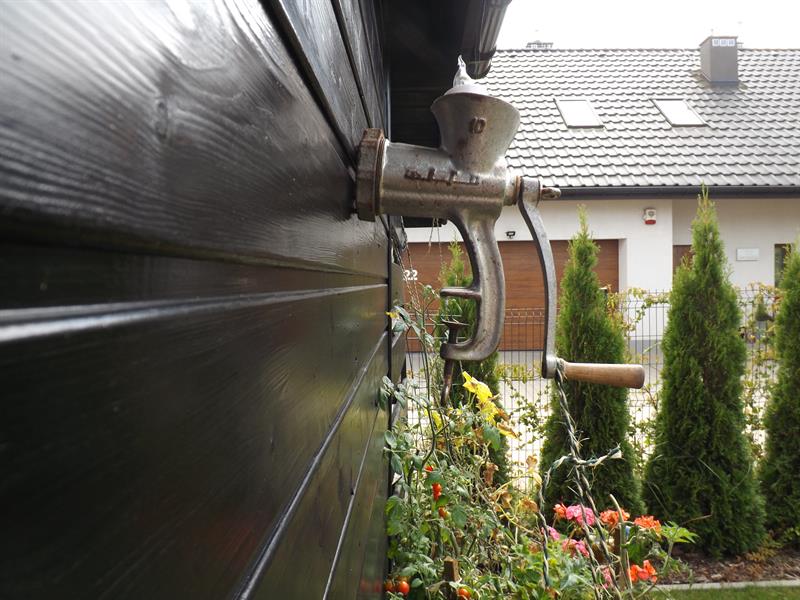 Siedząc na tarasie patrzymy na ogród. Uwagę przykuwa sporej wielkości stara maszyna rolnicza. – To sieczkarnia przywieziona z rodzinnego gospodarstwa – mówi p. Elżbieta. – Mąż dorobił do niej brakujące części i działa!