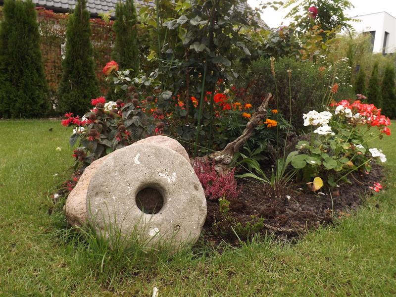 W ogrodzie zwracają uwagę nie tylko rośliny, ale również różnego rodzaju elementy dekoracyjne. Są nimi maszyny, jest także rzeźba Jezusa Frasobliwego oraz donice i oświetlenie. Wszystkie te formy dekoracyjne urozmaicają przydomowy ogród, stając się doskonale wkomponowanym w otoczenie motywem przewodnim poszczególnych części ogrodu. Moją uwagę przykuł dawno już niewidziany kamień do żaren. Okazało się, że przybył on aż spod Zamościa.
