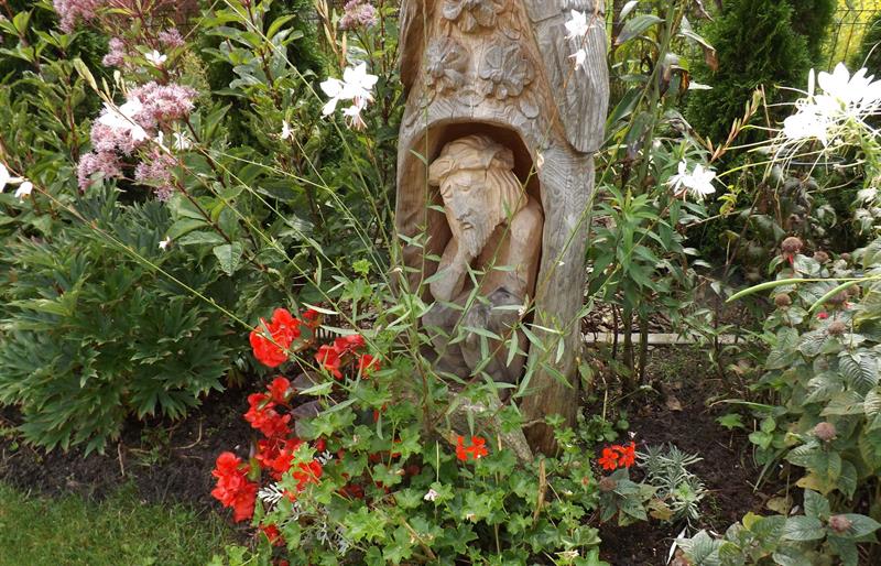 Pytam, nad czym się zastanawia Jezus Frasobliwy. W odpowiedzi słyszę, że nad przyrodą, nad tym co jeszcze dziś zobaczymy w ogrodzie. – Nasz ogród potrafi zaskakiwać – stwierdzają państwo Piesowiczowie. – W zeszłym tygodniu odwiedził nas sporej wielkości zaskroniec. Na porządku dziennym są w ogrodzie myszy, żaby i ptaki.
