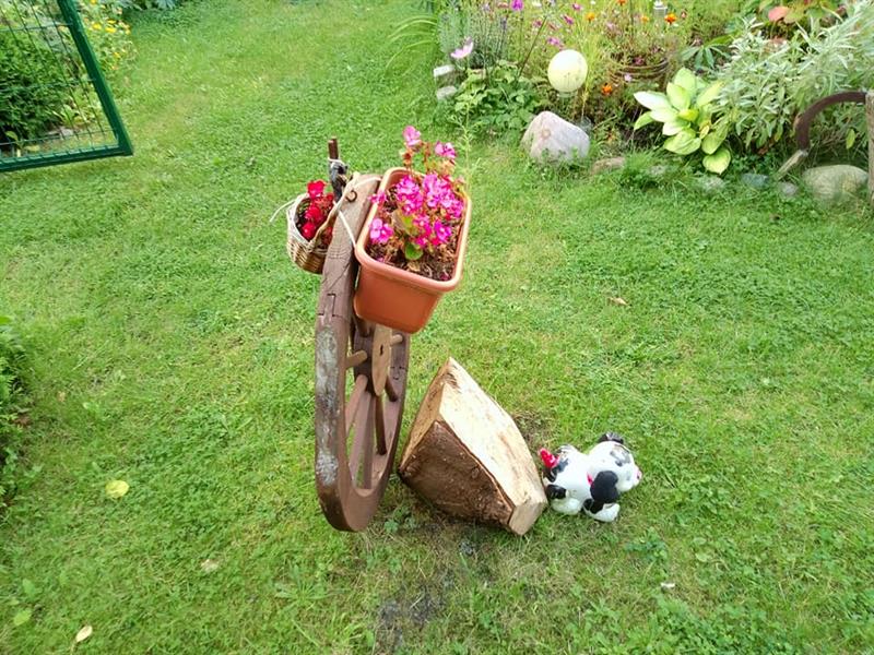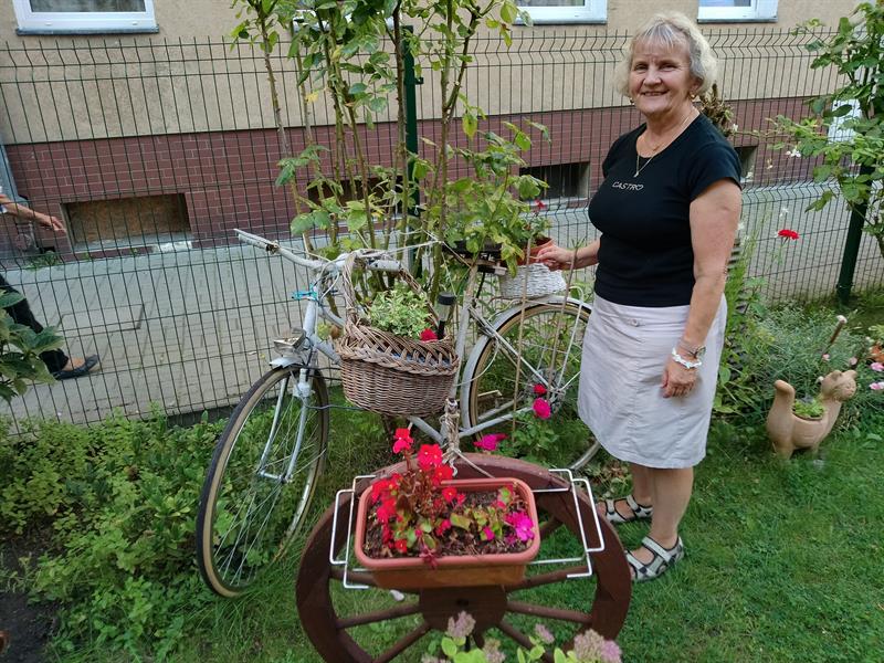 – Jeździłam kiedyś na tym rowerze – mówi. – Długo stał w piwnicy i niszczał. Teraz jest ozdobą podwórka. Dołożyłam do niego wiklinowe kosze i donice z kwiatami.