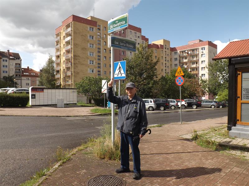 Nasz spacer po osiedlu zaczęliśmy od strony ulicy S.I. Witkiewicza. Następnie ulicą św. Jana Bosko doszliśmy do ulicy Santockiej i 26 Kwietnia. Mój przewodnik, p. Zenon Łoboda, poprowadził mnie osiedlowymi ścieżkami. Po drodze zatrzymywaliśmy się, aby zrobić zdjęcia co ciekawszych miejsc. – Na moich oczach zmieniało się osiedle – stwierdził p. Łoboda. – Na początku nie było tak zielono jak teraz. To przyszło z czasem. Ja mam taką zasadę, że jak „Chcesz mieszkać ładnie, to działaj”. No i działam, a wraz ze mną również inni członkowie Rady Osiedla.