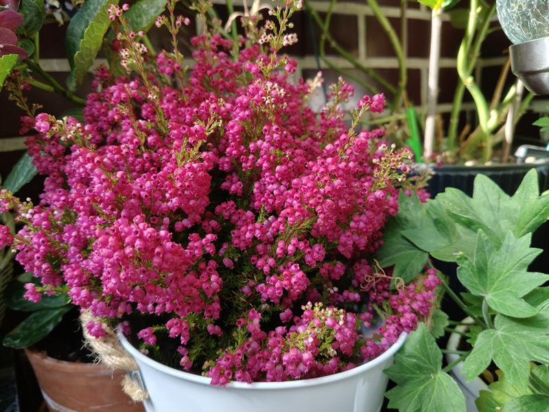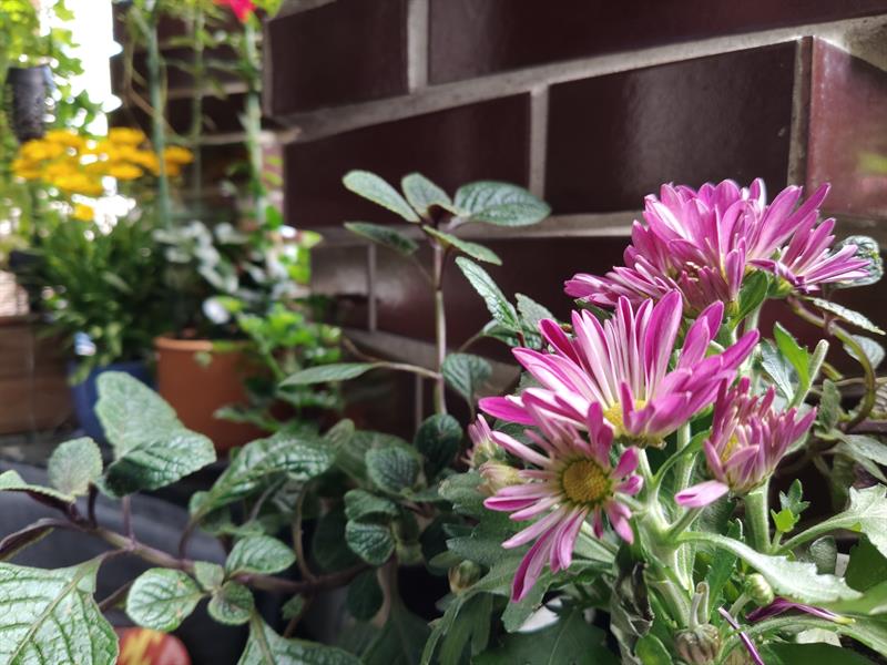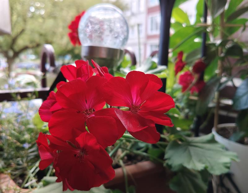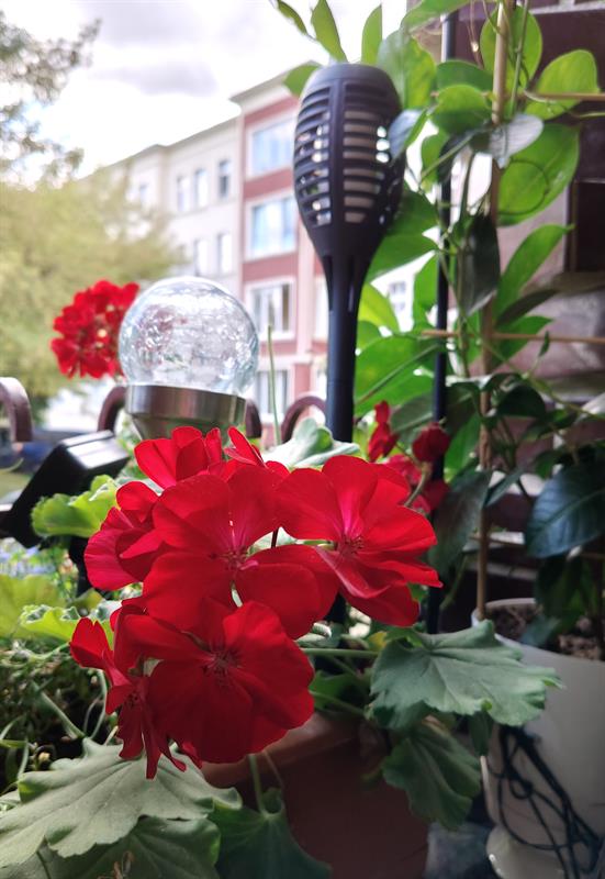 W tym roku w roli reprezentacyjnej występują pelargonie kaskadowe: białe i różowe w części centralnej, a czerwone – po bokach. Z daleka przyciągają uwagę bujnością – morzem drobnych płatków. Jednak to, co na balkonie najlepsze, jest w ukryciu. Mowa o roślinach, w których tonie jego prywatne wnętrze.