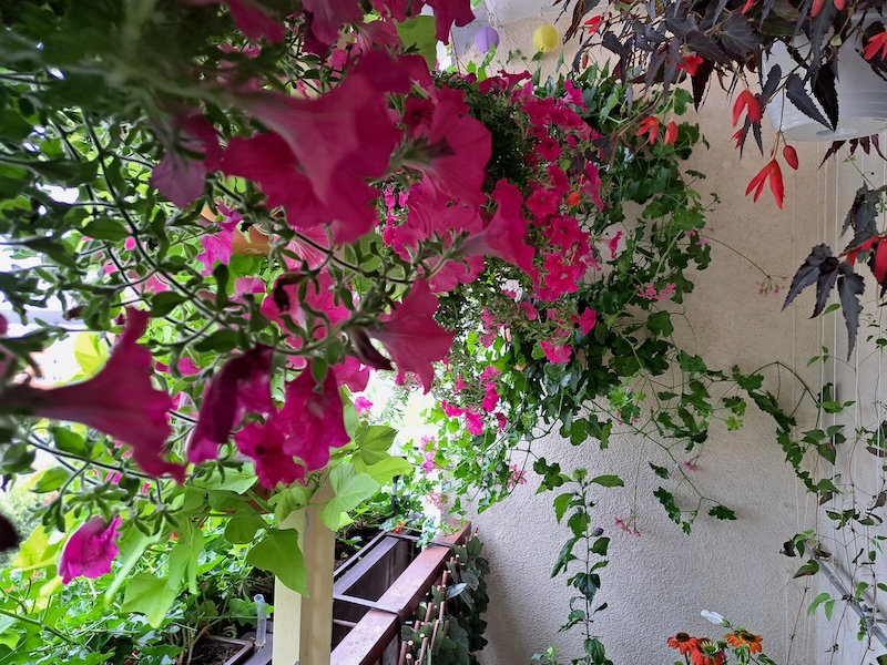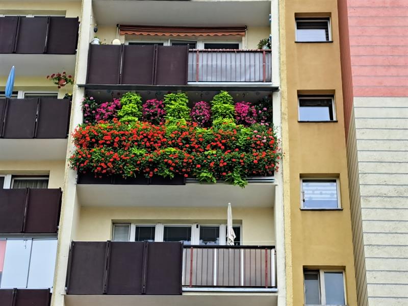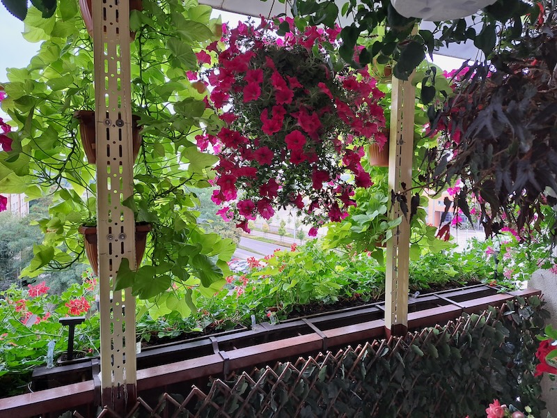 Balkon pana Tadeusza jest nie mniej okazały niż znajdujący się na dole ogródek. Futerko kwiatów szczelnie wypełnia jego front na wysokości całego piętra. Kolorowy kożuszek tworzą między innymi pelargonie i surfinie. Pan Tadeusz każdego roku z roślin tworzy nową kompozycję.