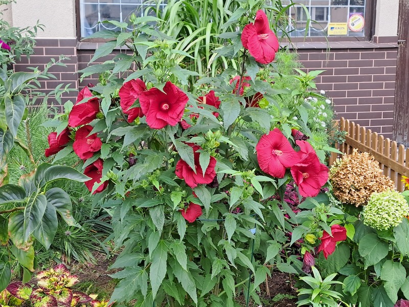 W ogrodzie widzimy duże, czerwone kwiaty hibiskusa, bez, magnolię, budleje, róże, hortensje i wiele innych roślin.