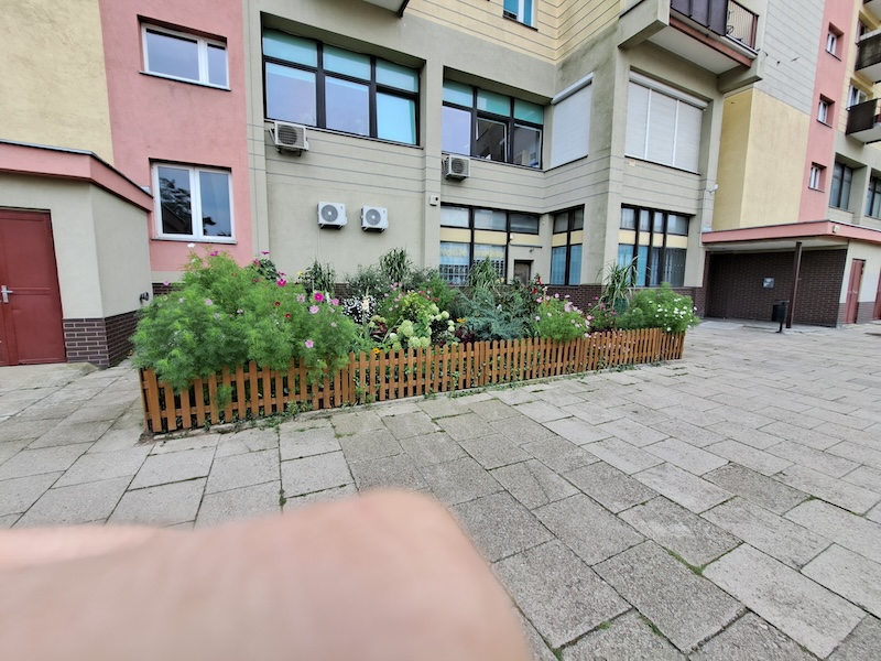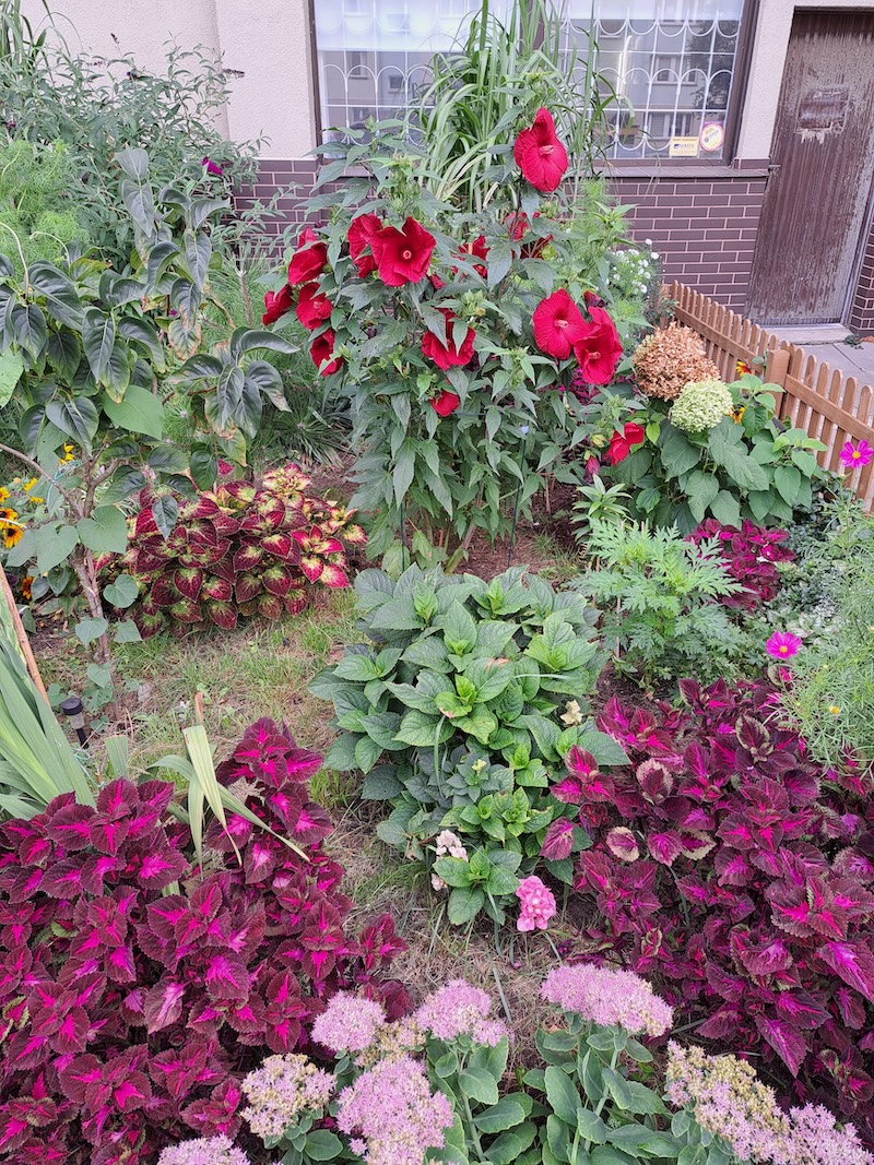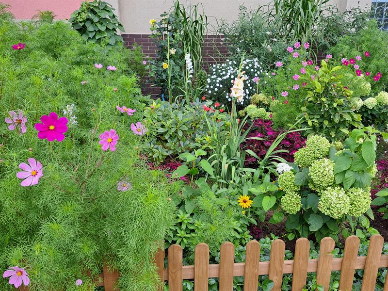 – W miejscu ogrodu dawniej był wybieg dla psów otoczony żywopłotem – mówi gospodarz miejsca. – Razem z sąsiadem Waldemarem Zalewskim zlikwidowaliśmy ten wybieg. Spółdzielnia dofinansowała nowe ogrodzenie w formie drewnianego płotka. Rośliny pochodzą z różnych źródeł – niektóre z działki, niektóre sąsiad przywiózł od wujka, a inne zostały kupione.