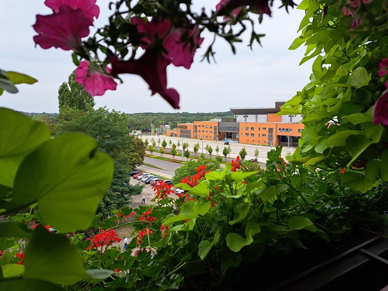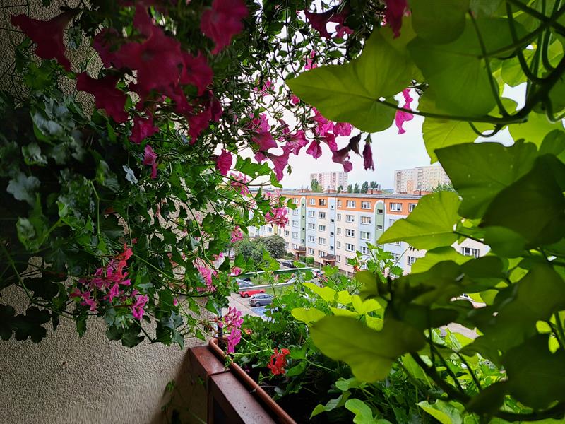 Z balkonu rozpościera się widok na zabudowania osiedla Zawadzkiego i Netto Arenę. Szczecińska hala ujęta jest w winietę z różowych surfinii.