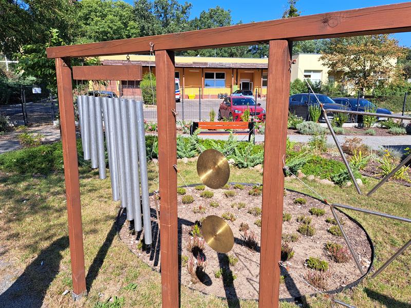 Terapeutyczna funkcja ogrodu polega zarówno na przebywaniu w nim, jak i na jego uprawie. Ogród otoczony jest metalowym ogrodzeniem, które latem porasta jednoroczny bluszcz. Na lewo od furtki znajduje się drewniany składzik na narzędzia, na którego ścianie umieszczony jest domek dla owadów zapylających kwiaty. Na wprost ułożona jest ścieżka, zbudowana z różnych materiałów - kilku rodzajów kamieni, kory drzewnej czy piasku. Chodzenie po niej oddziaływać ma na zmysł dotyku. Po prawej stoi przestronna altana, a za nią widać ścieżkę muzyczną, wzdłuż której biegnie konstrukcja z podwieszonymi instrumentami - metalowymi talerzami czy rurkami przypominającymi organowe piszczałki.