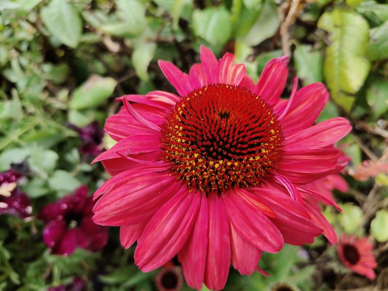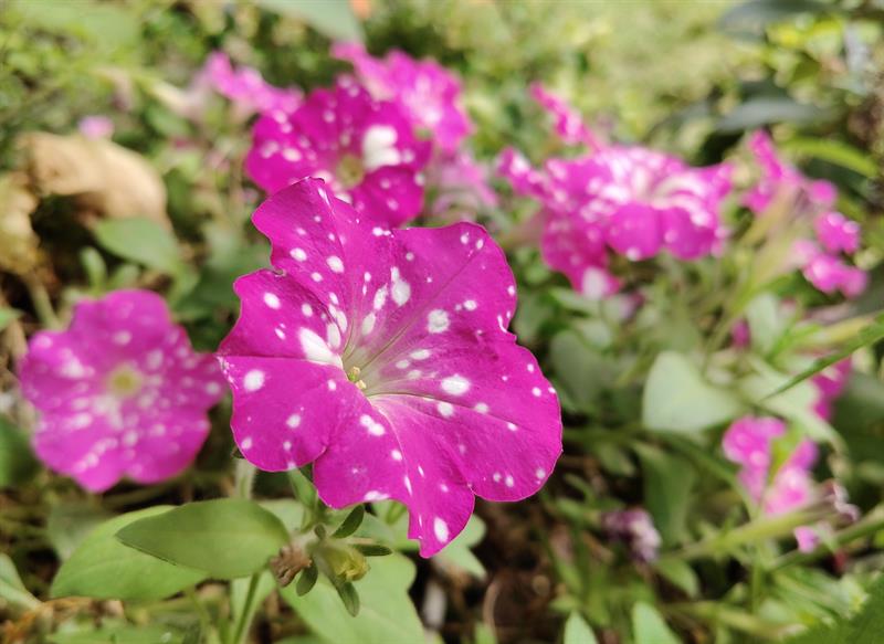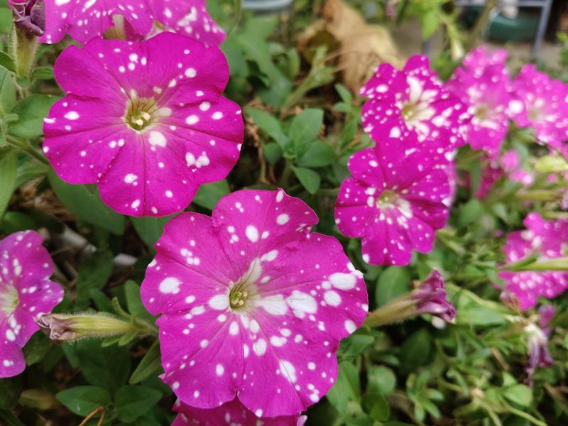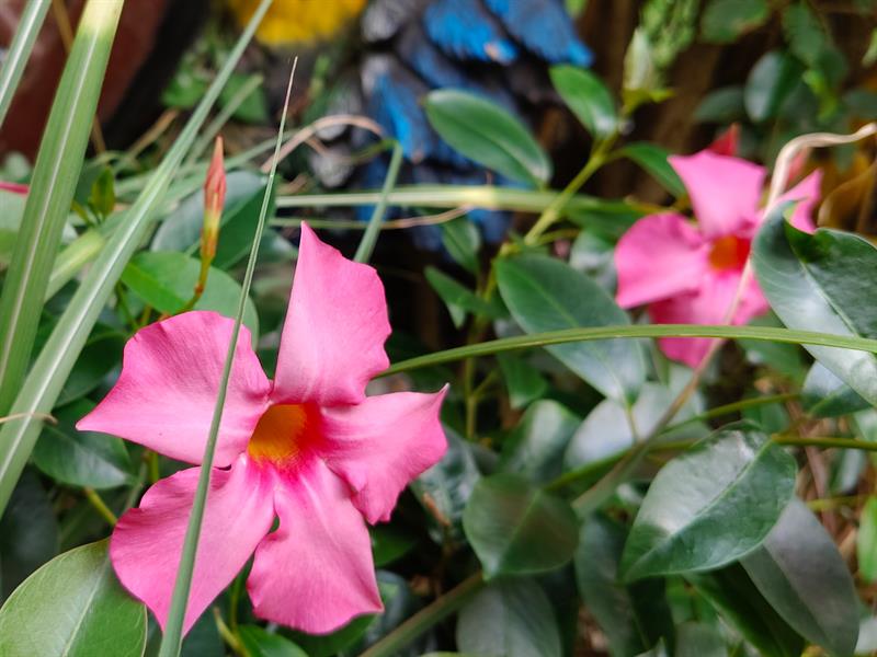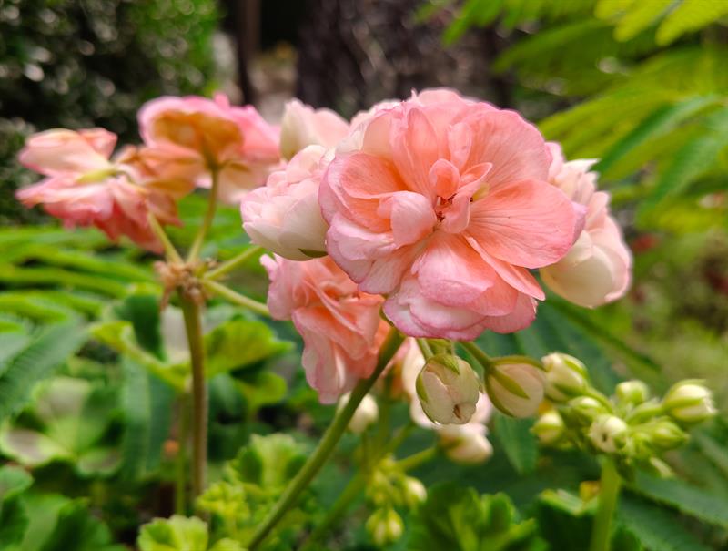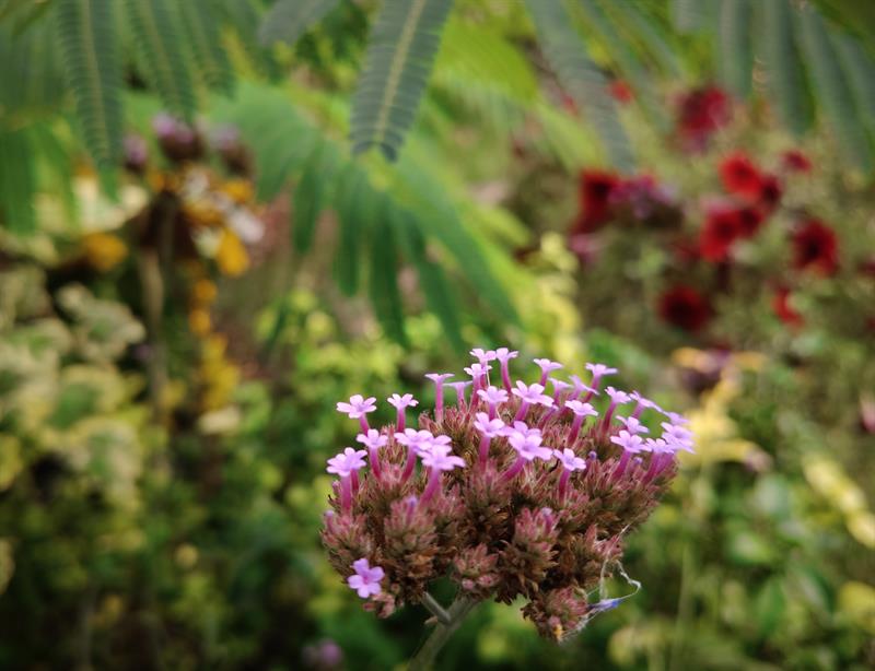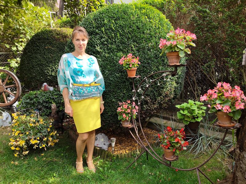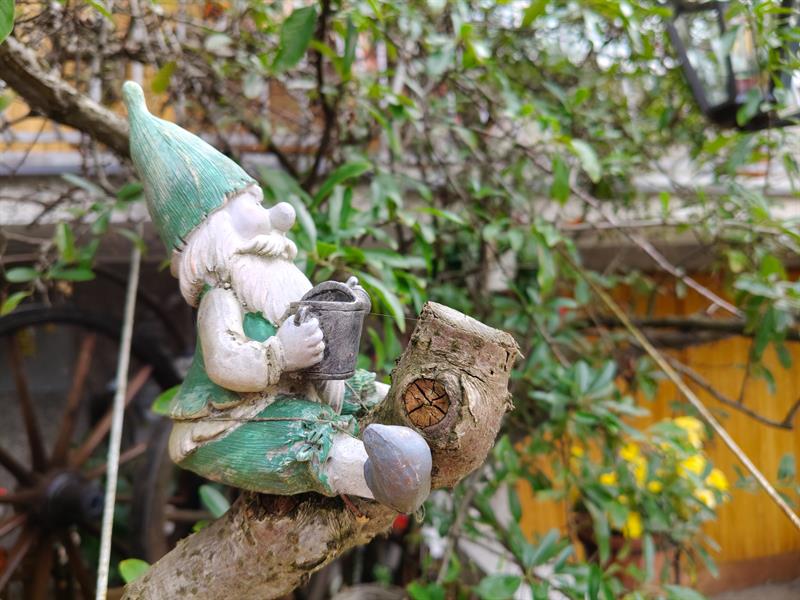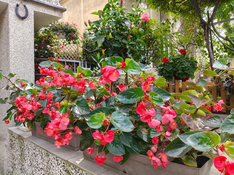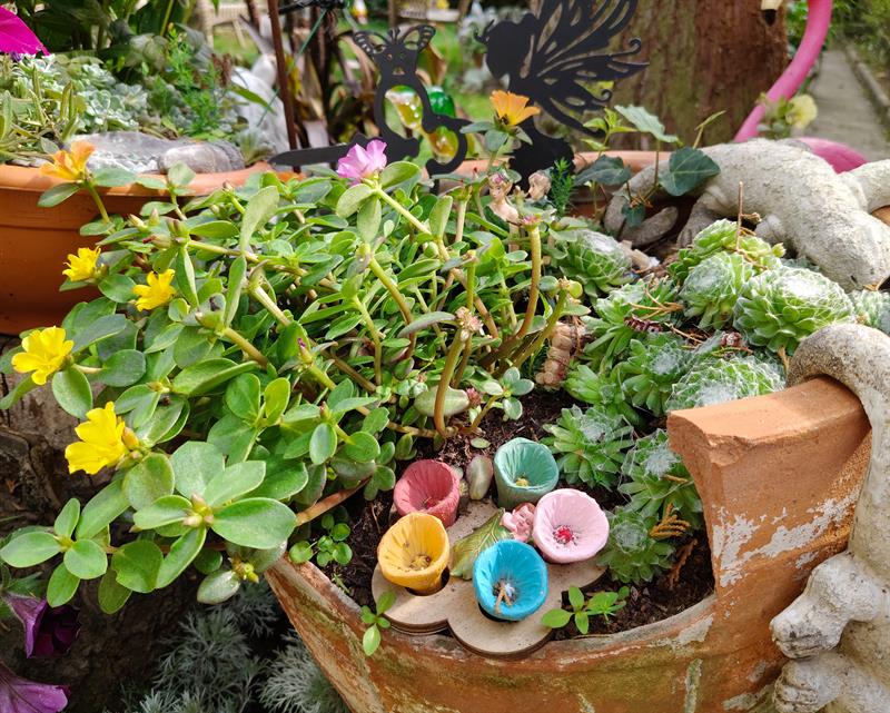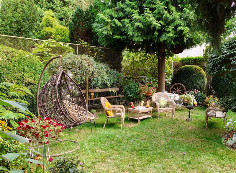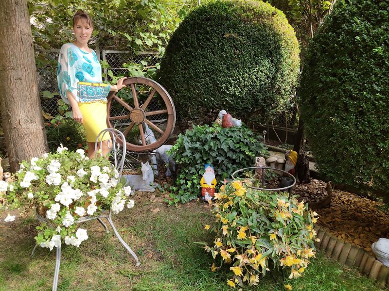 Na wejściu gości witają wybujałe czerwone begonie, hosty i równie efektowne canny oraz róże. Za nimi barwny korytarz tworzą okazałe sezonowe kwiaty w wielu odmianach – m.in. petunie, pelargonie, surfinie i bratki – rozmieszczone w donicach i na stojakach. Dopiero za nimi – starannie przystrzyżonym żywopłotem śnieguliczek – otwiera się ogrodowa przestrzeń, w jakiej nie trudno dostrzec mnóstwo dekoracyjnych detali. Pośród hibiskusów, rododendronów, jeżówek i rudbekii wyglądają nawet wróżki i elfy.