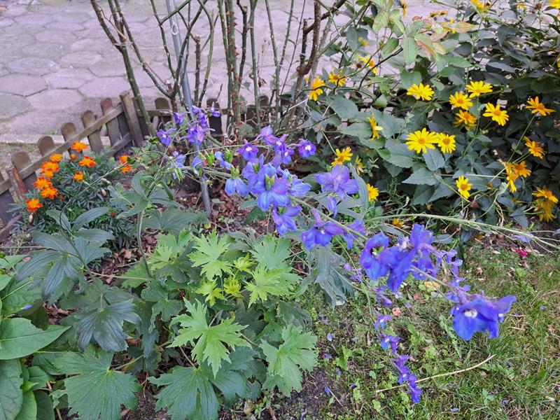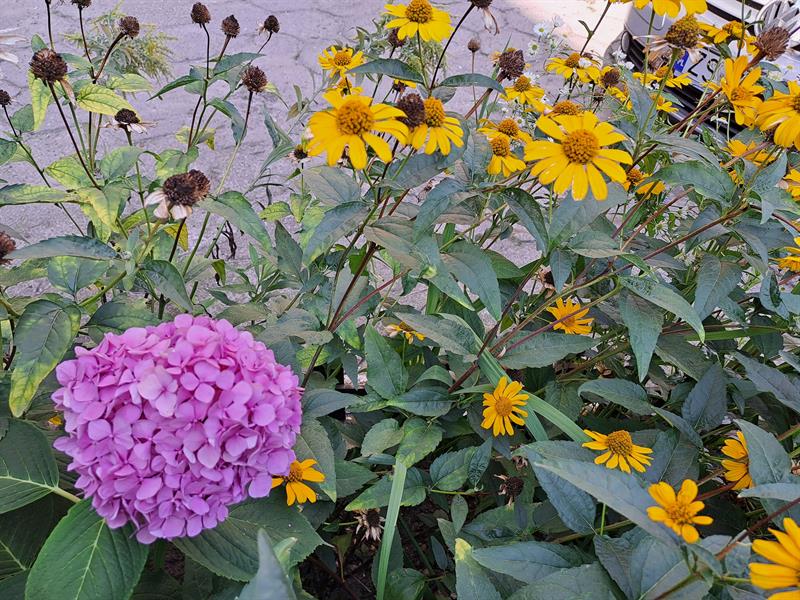 - To są dziwaczki. Ciekawe kwiaty - mówi p. Franciszek - wieczorem się zamykają, a rano otwierają. Obok rosną floksy, a tu hortensje. Mamy też między innymi miętę, lubczyk, bazylię i liść laurowy.