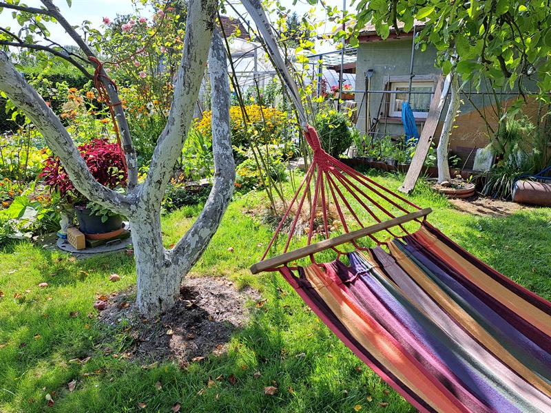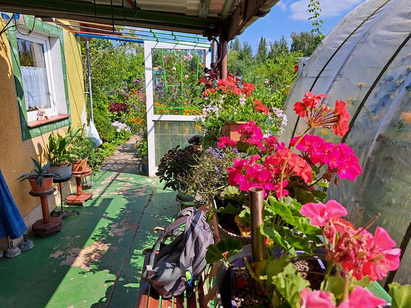 Jesteśmy na miejscu. Na działce kwitną kwiaty, rosną liczne warzywa i owoce.